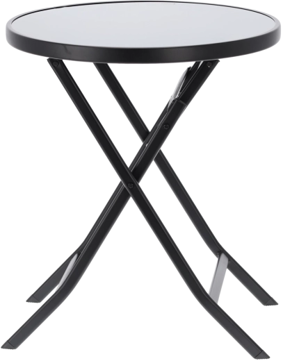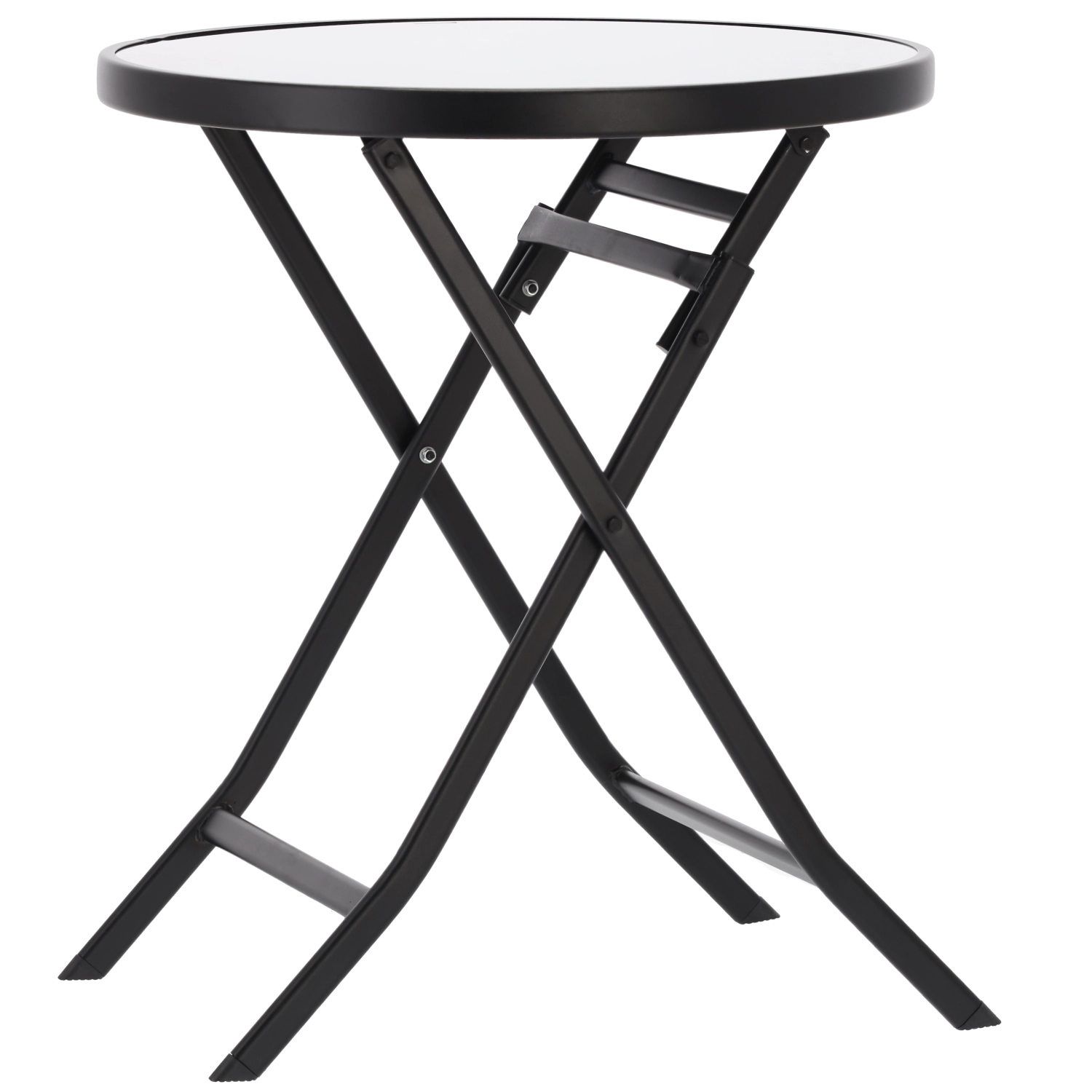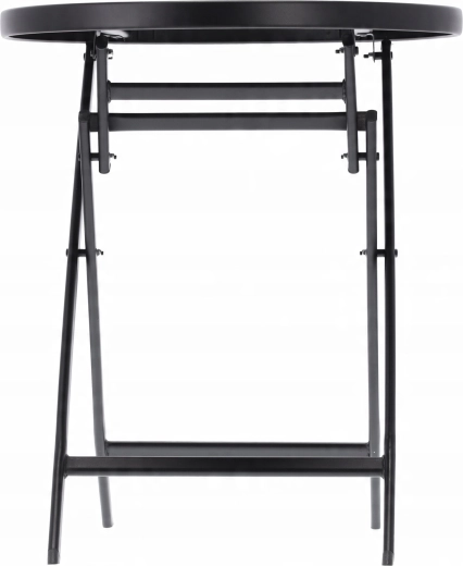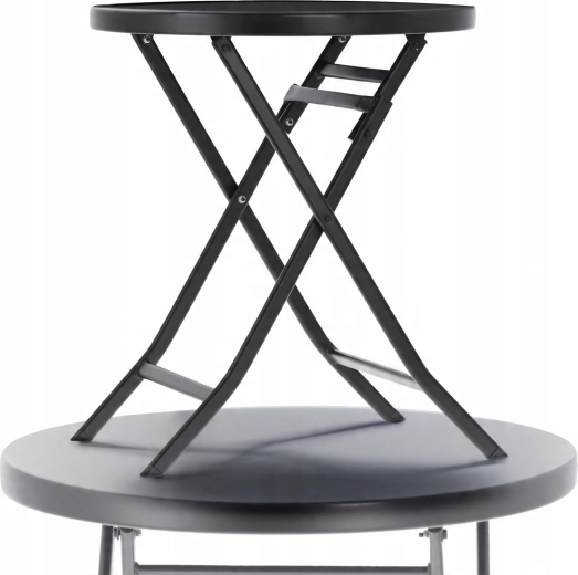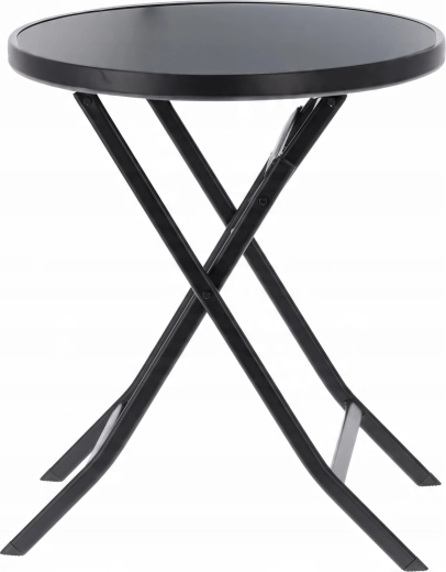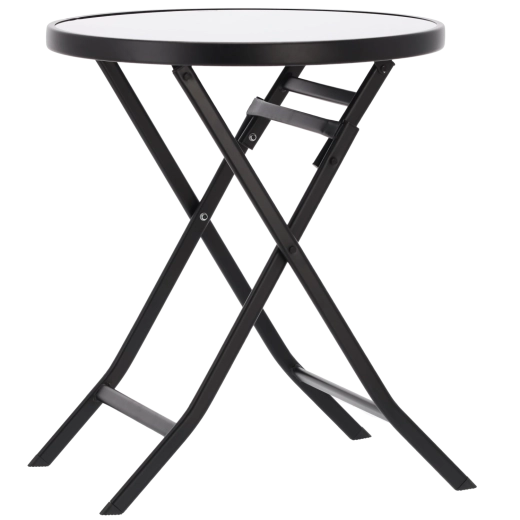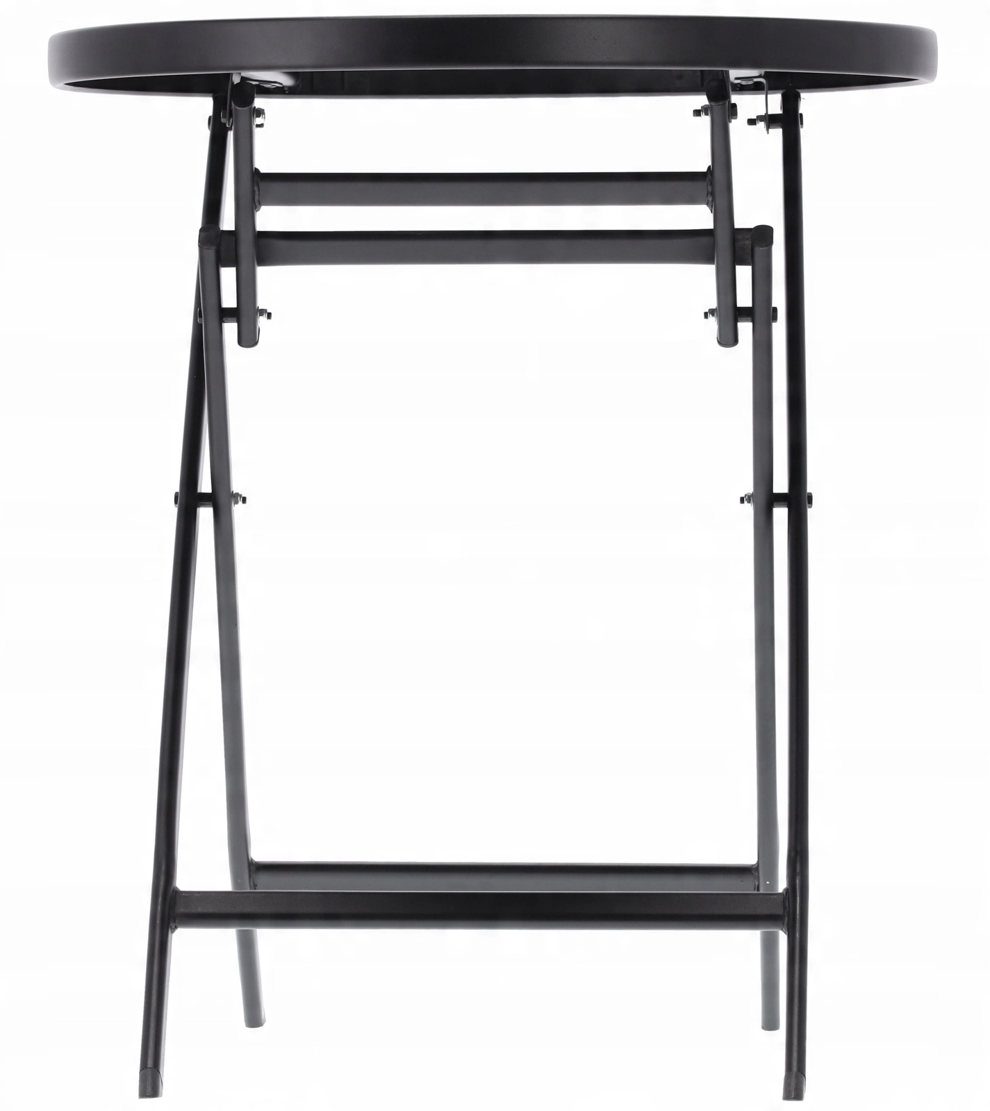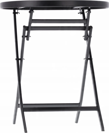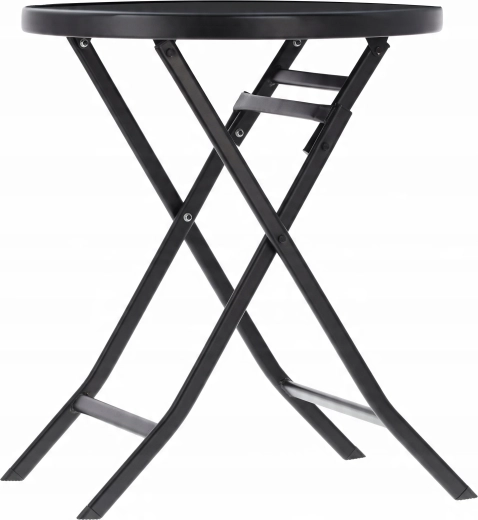 Elegante inklapbare tafel met een rond blad van 60 cm in zwarte kleur, die modern design, een duurzaam stalen frame en eenvoudig onderhoud combineert. Dankzij de compacte afmetingen en het inklapmechanisme ideaal voor balkon, terras en tuin.