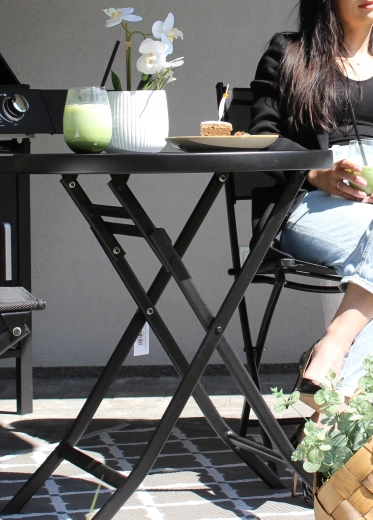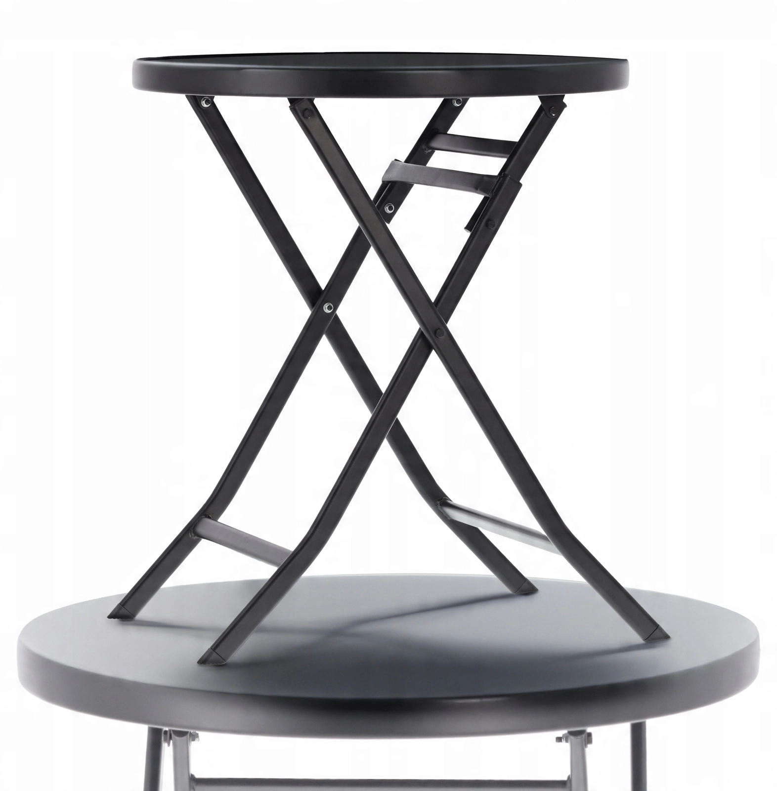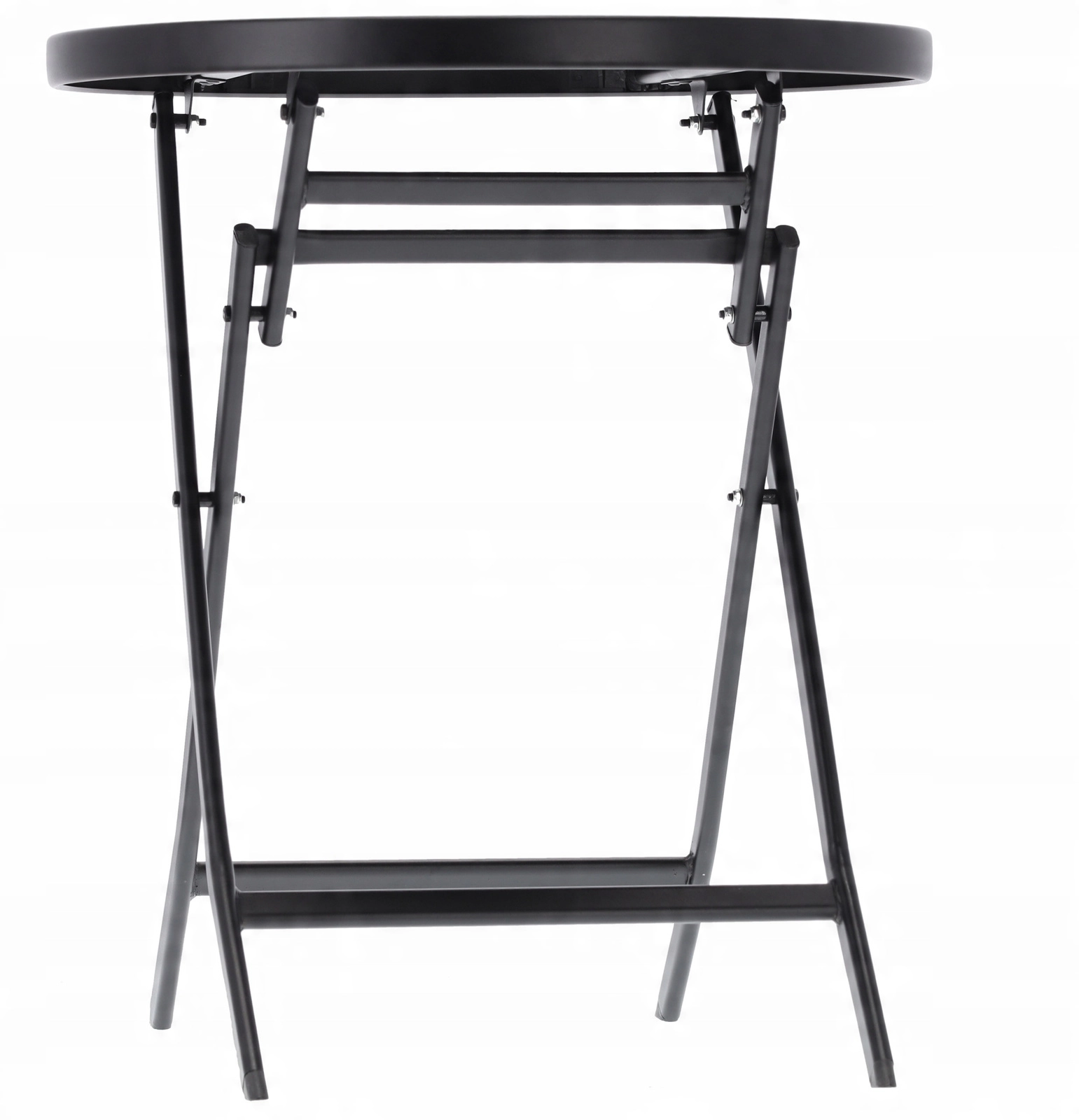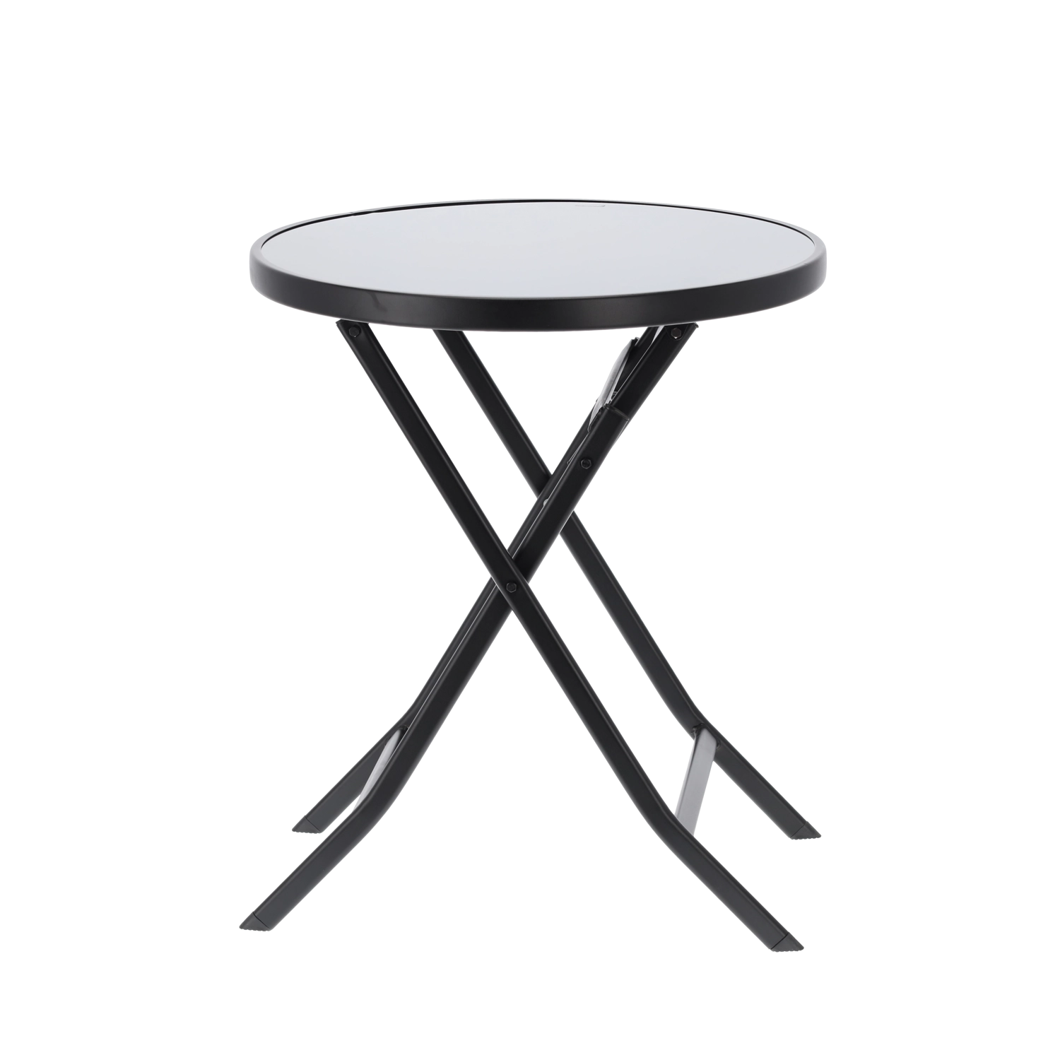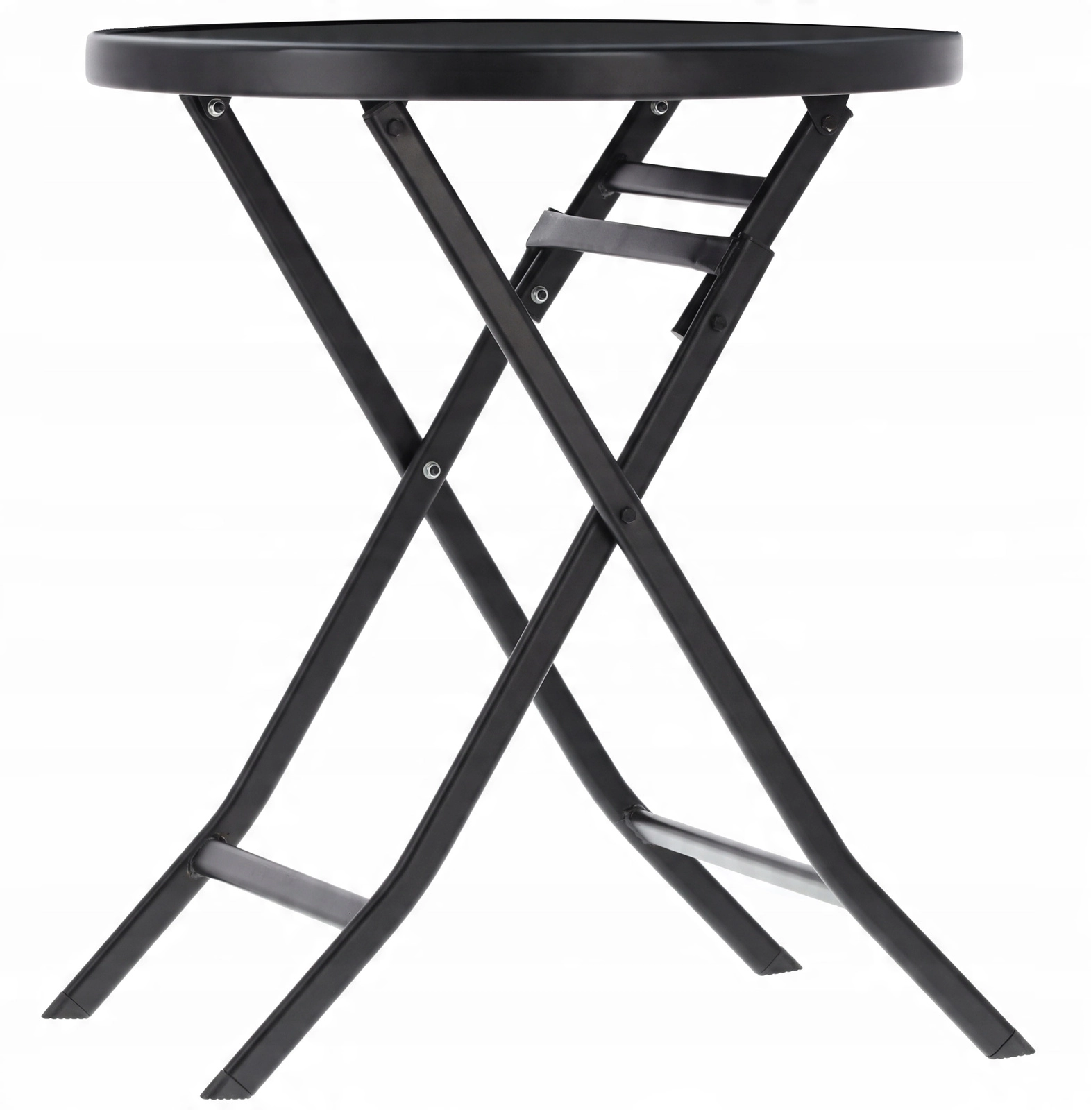 Elegante inklapbare tafel met een rond blad van 60 cm in zwarte kleur, die modern design, een duurzaam stalen frame en eenvoudig onderhoud combineert. Dankzij de compacte afmetingen en het inklapmechanisme ideaal voor balkon, terras en tuin.