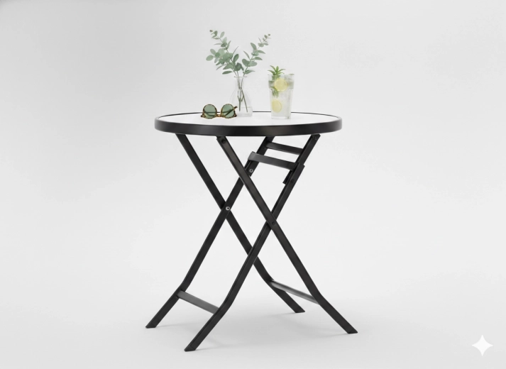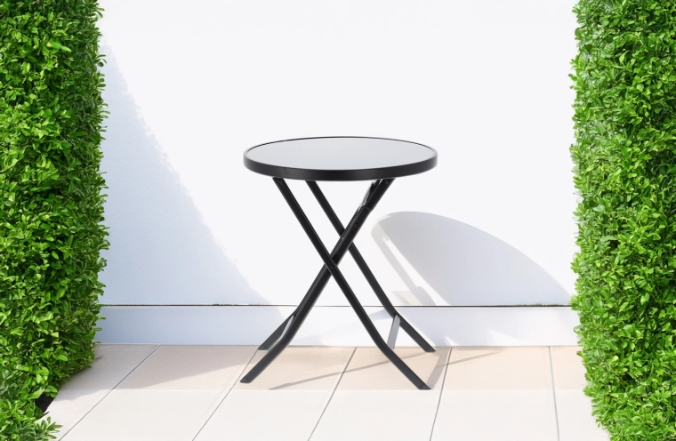 Gekruiste poten en een inklapmechanisme maken snel inklappen en compact opbergen of verplaatsen mogelijk, perfect voor balkons en kleine terrassen.