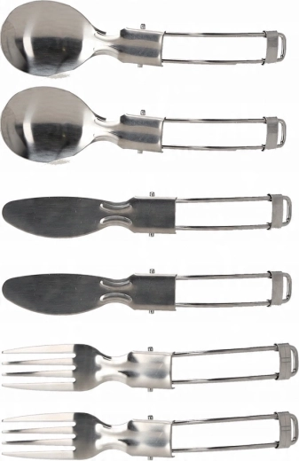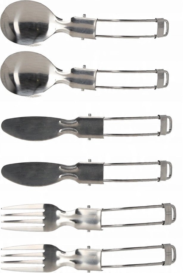 Opvouwbaar bestek van roestvrij staal, schroefkarabiners en transportetuis houden alles overzichtelijk en veilig bij elkaar.