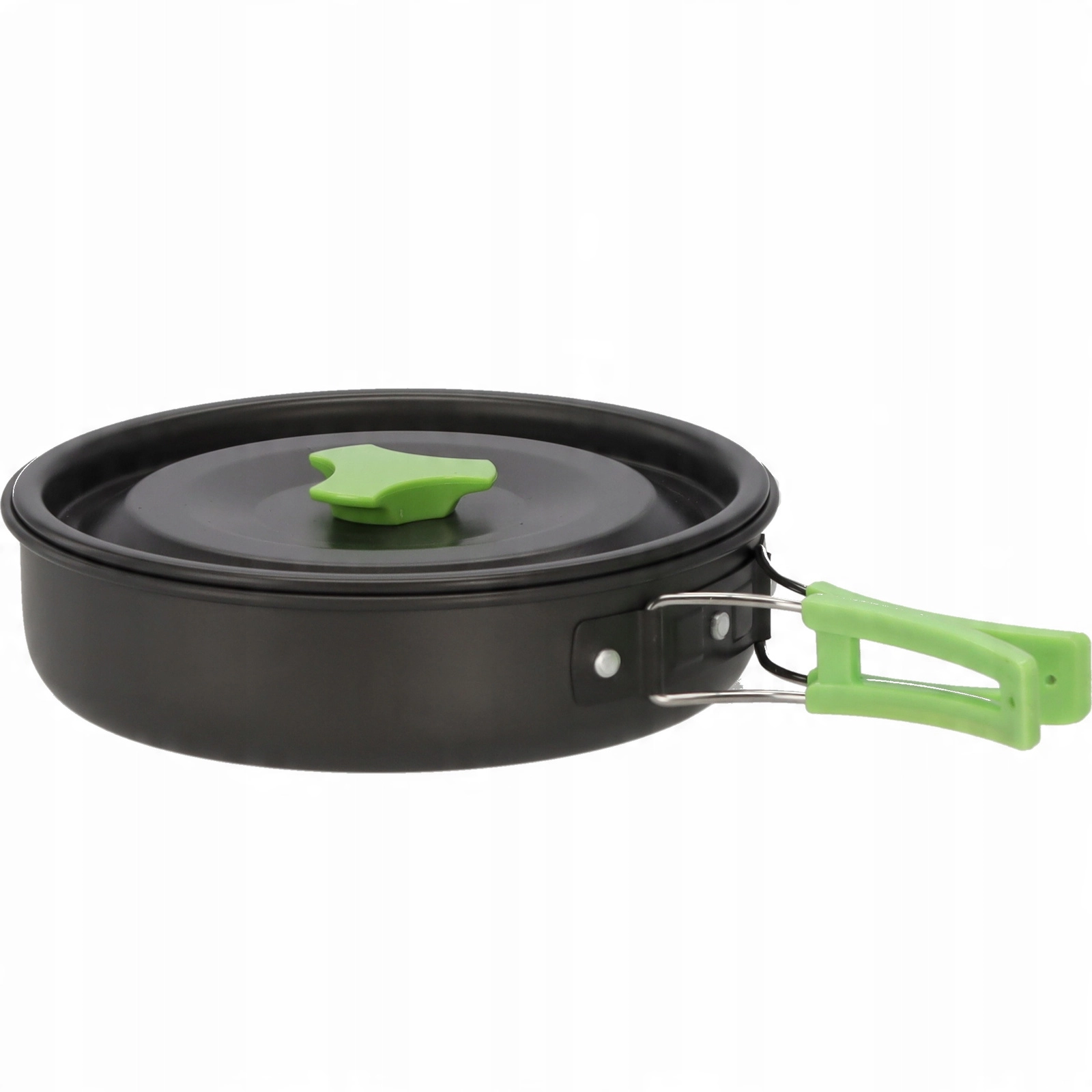Het servies is ontworpen voor snel en comfortabel koken op de camping: robuuste materialen weerstaan veelvuldig gebruik, opvouwbare groene handgrepen besparen ruimte en maken hanteren eenvoudiger. Metalen mokken, opvouwbaar bestek en schroefkarabiners maken de uitrusting compleet, zodat je alles bij de hand hebt.