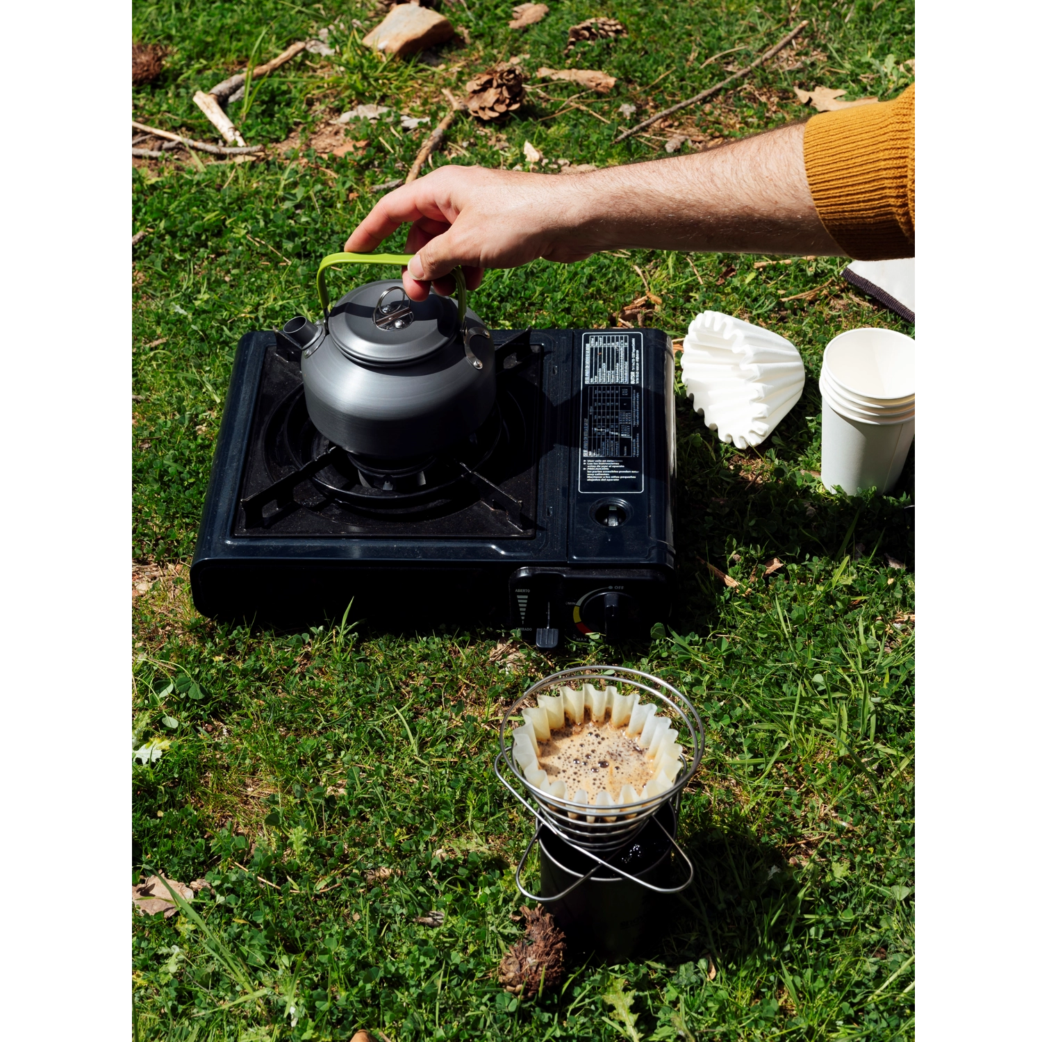 De lichte metalen ketel met brede bodem zorgt voor stabiliteit op de brander en snel koken – ideaal voor koffie of thee onderweg.