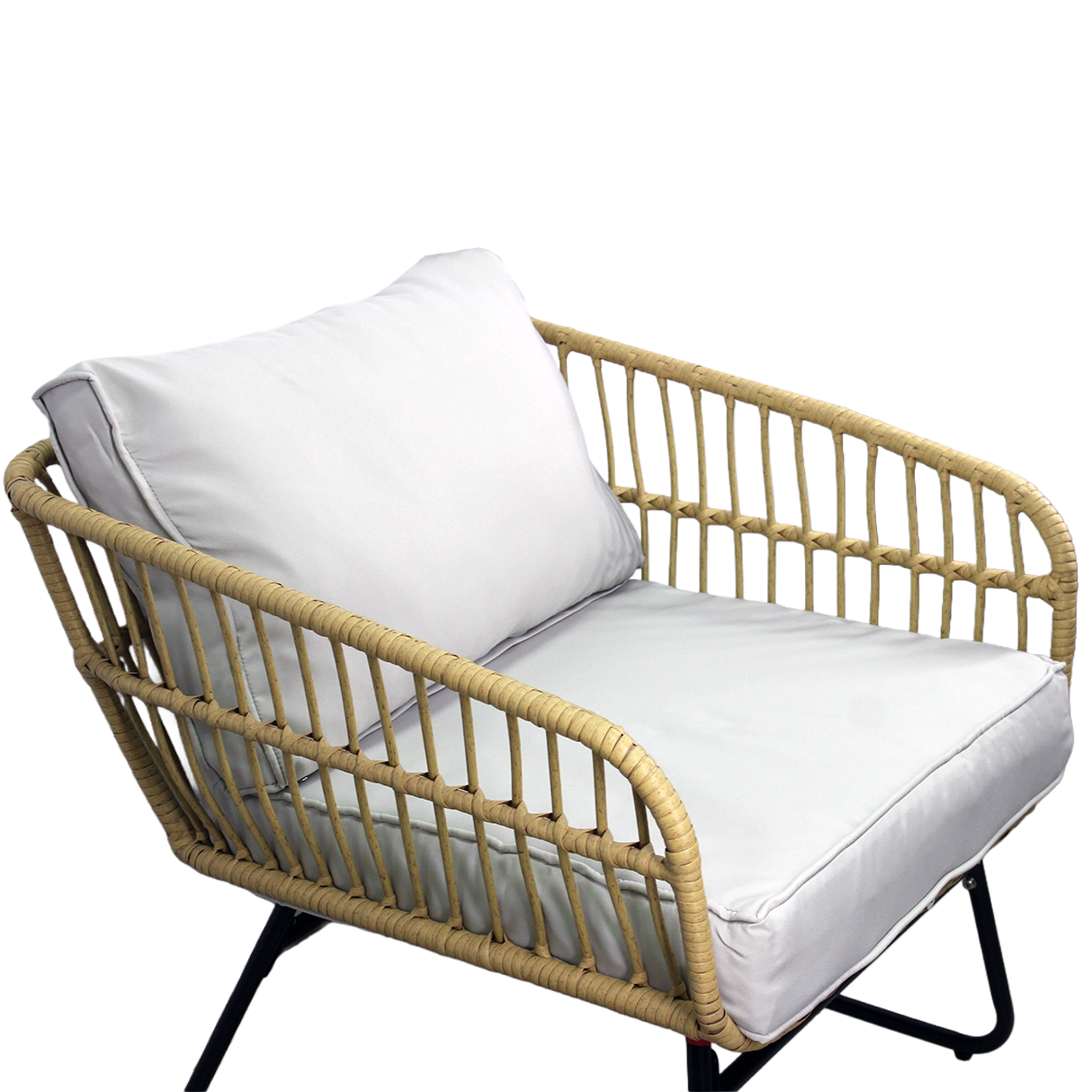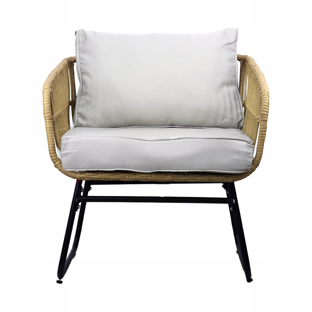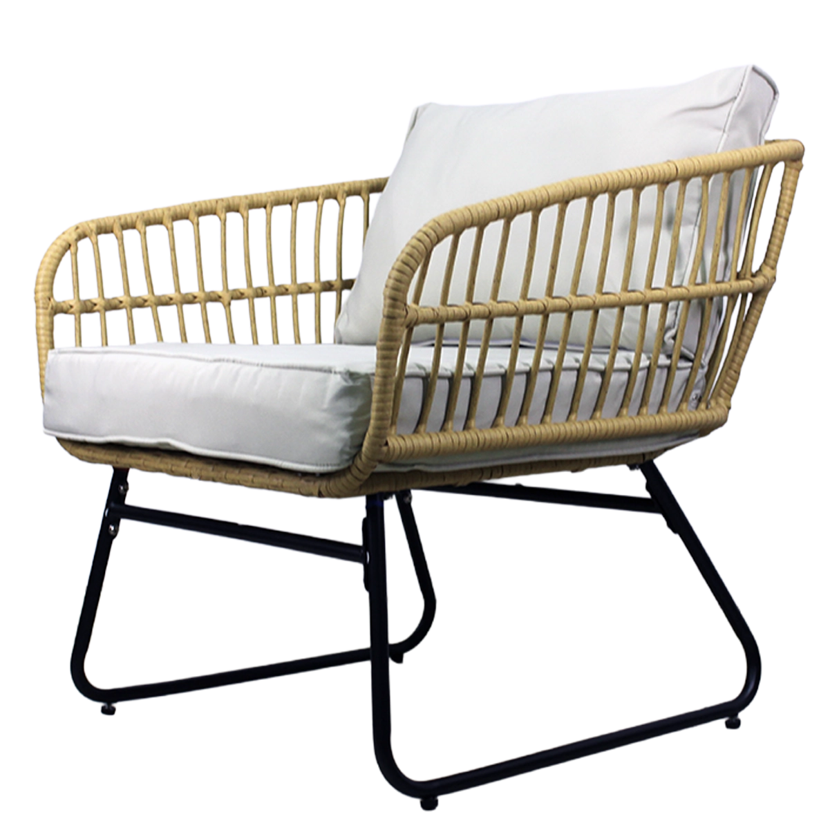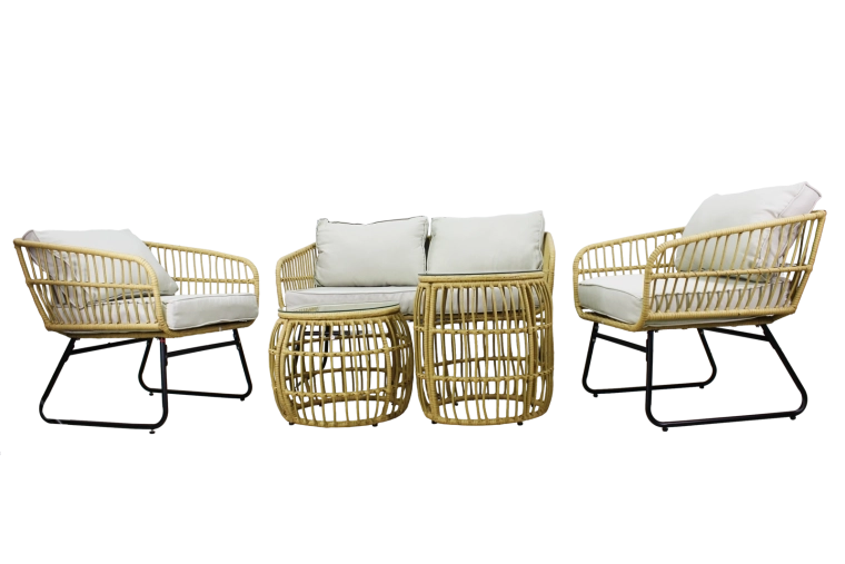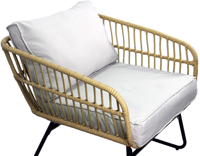 De natuurlijke look van kunstrotan met zwarte metalen poten oogt modern en elegant. Dankzij het lage gewicht is de set gemakkelijk te verplaatsen en aan te passen aan de ruimte.