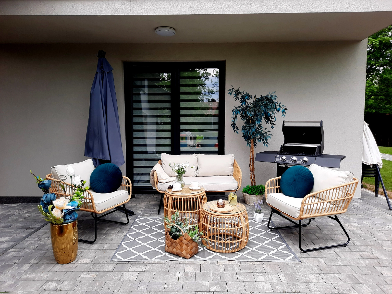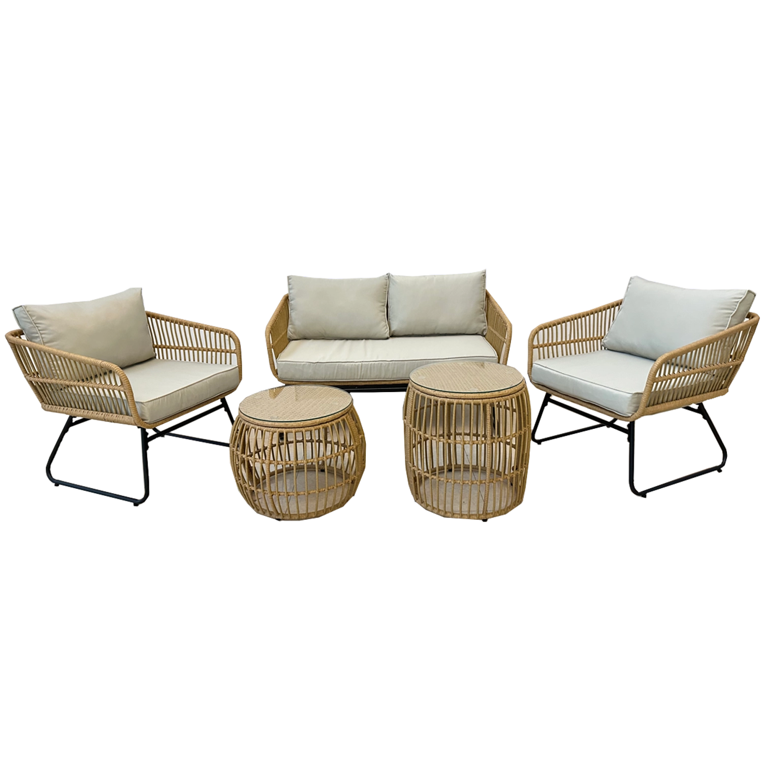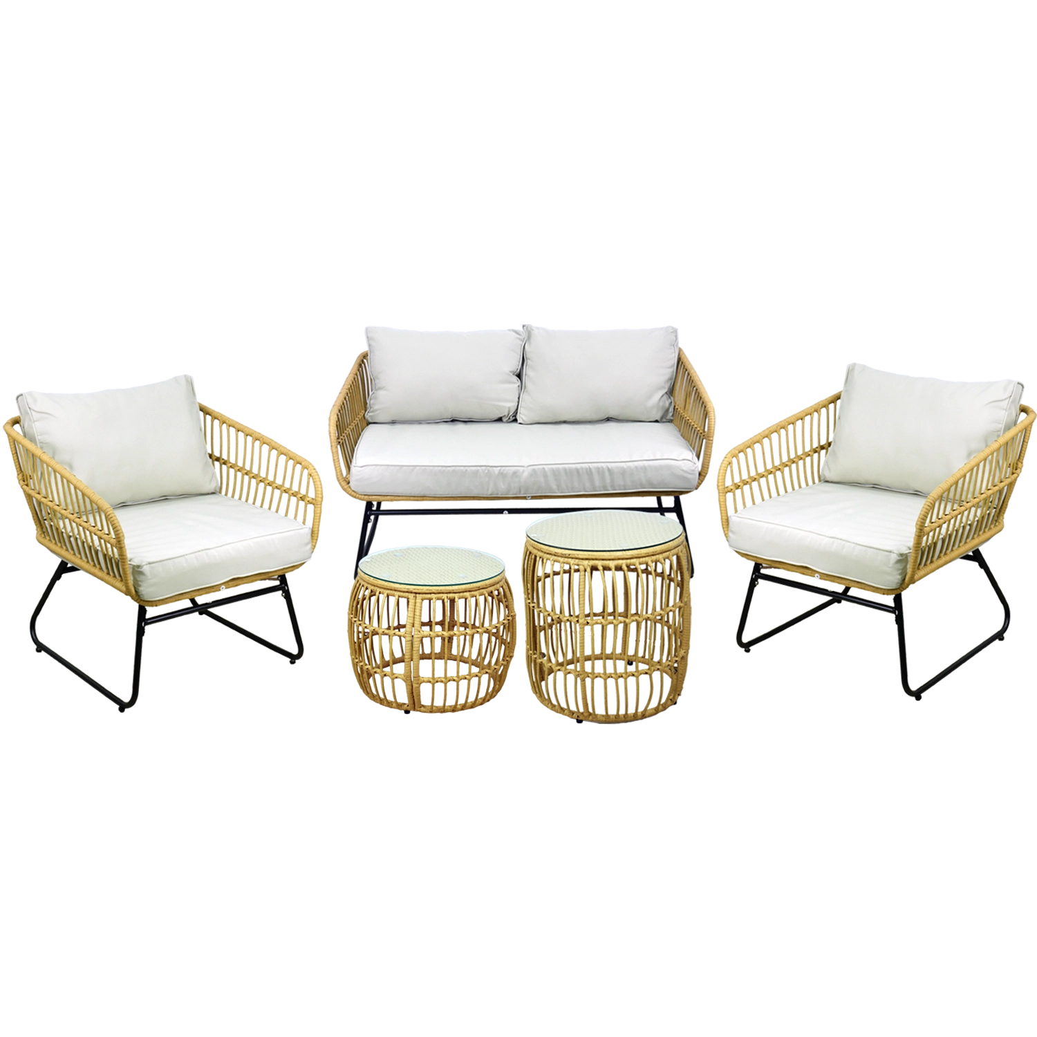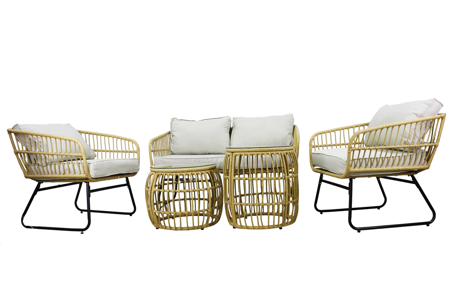 De natuurlijke look van kunstrotan met zwarte metalen poten oogt modern en elegant. Dankzij het lage gewicht is de set gemakkelijk te verplaatsen en aan te passen aan de ruimte.