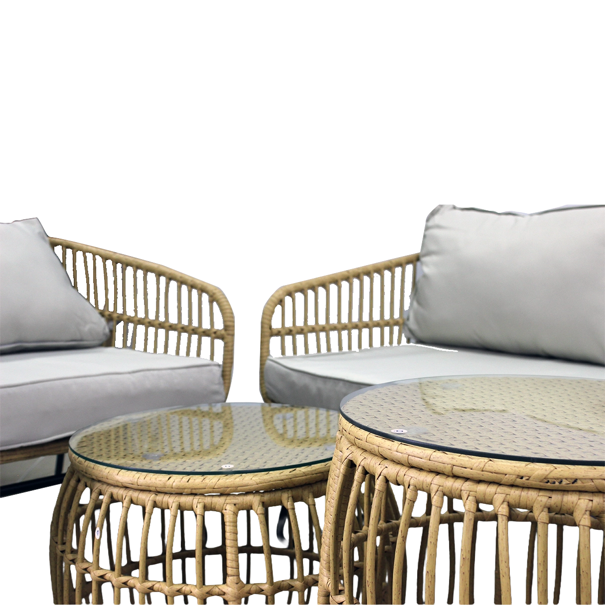 De tafels zijn uitgerust met 5 mm gehard glas voor extra krasbestendigheid en stabiliteit. Het robuuste frame van gegalvaniseerd staal verhoogt de levensduur en het draagvermogen van de hele set – fauteuil tot 110 kg, bank 200 kg, tafels 30 kg. De neutrale kleurtinten in natuurlijke rotanlook met grijze kussens laten zich gemakkelijk combineren met ander tuinmeubilair.