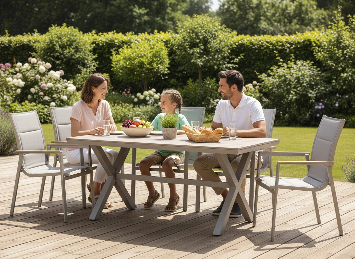 De tafel blinkt uit in eenvoudig onderhoud – een vochtige doek is voldoende. Dankzij het royale blad kunt u comfortabel familie en gasten plaatsen en genieten van ontspannen dineren in de buitenlucht.