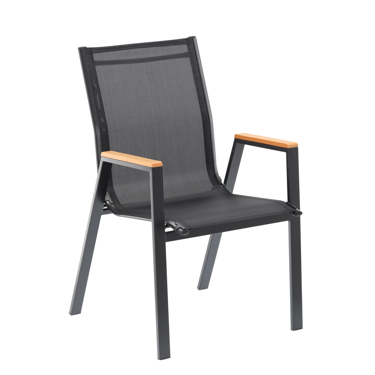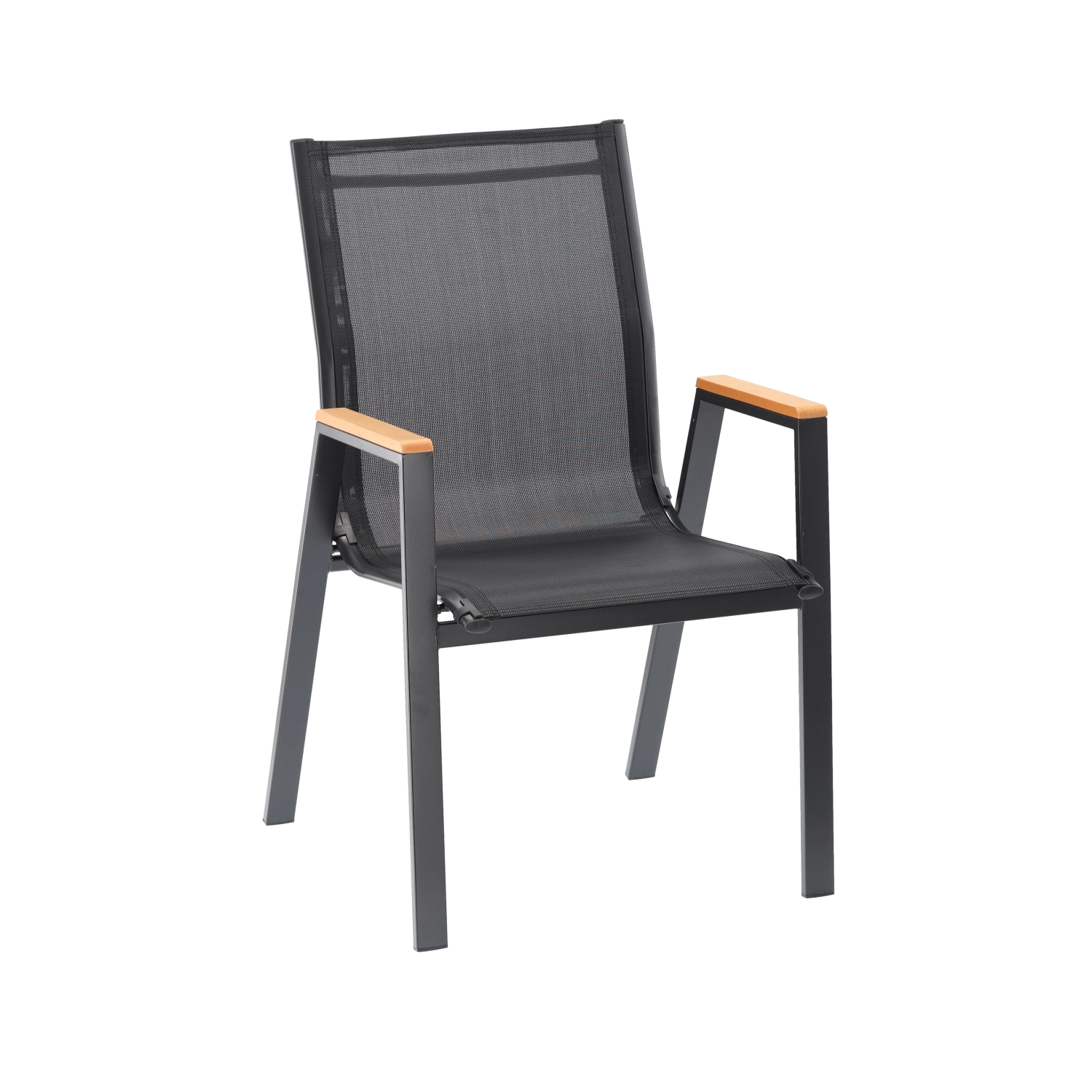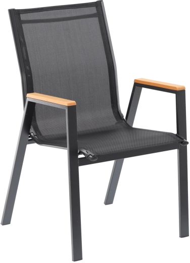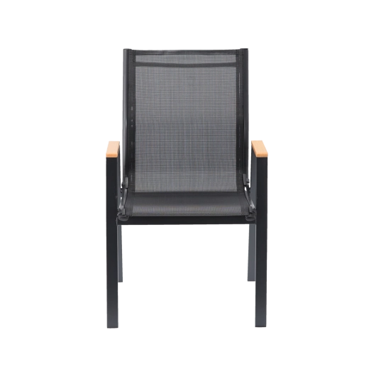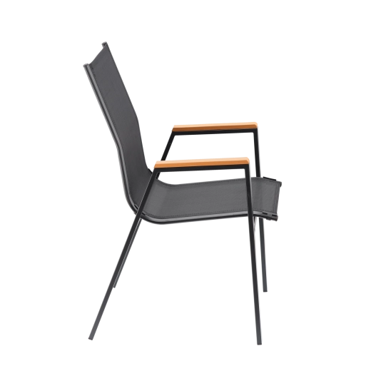Elegante en duurzame tuinstoel met stalen frame, comfortabele zitting en rugleuning van ademend Textilene-mesh en stijlvolle armleuningen van polywood. Biedt hoog comfort, een stabiele constructie en weersbestendigheid voor terras, balkon en tuin.
