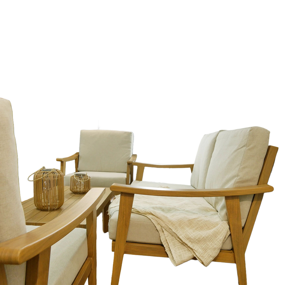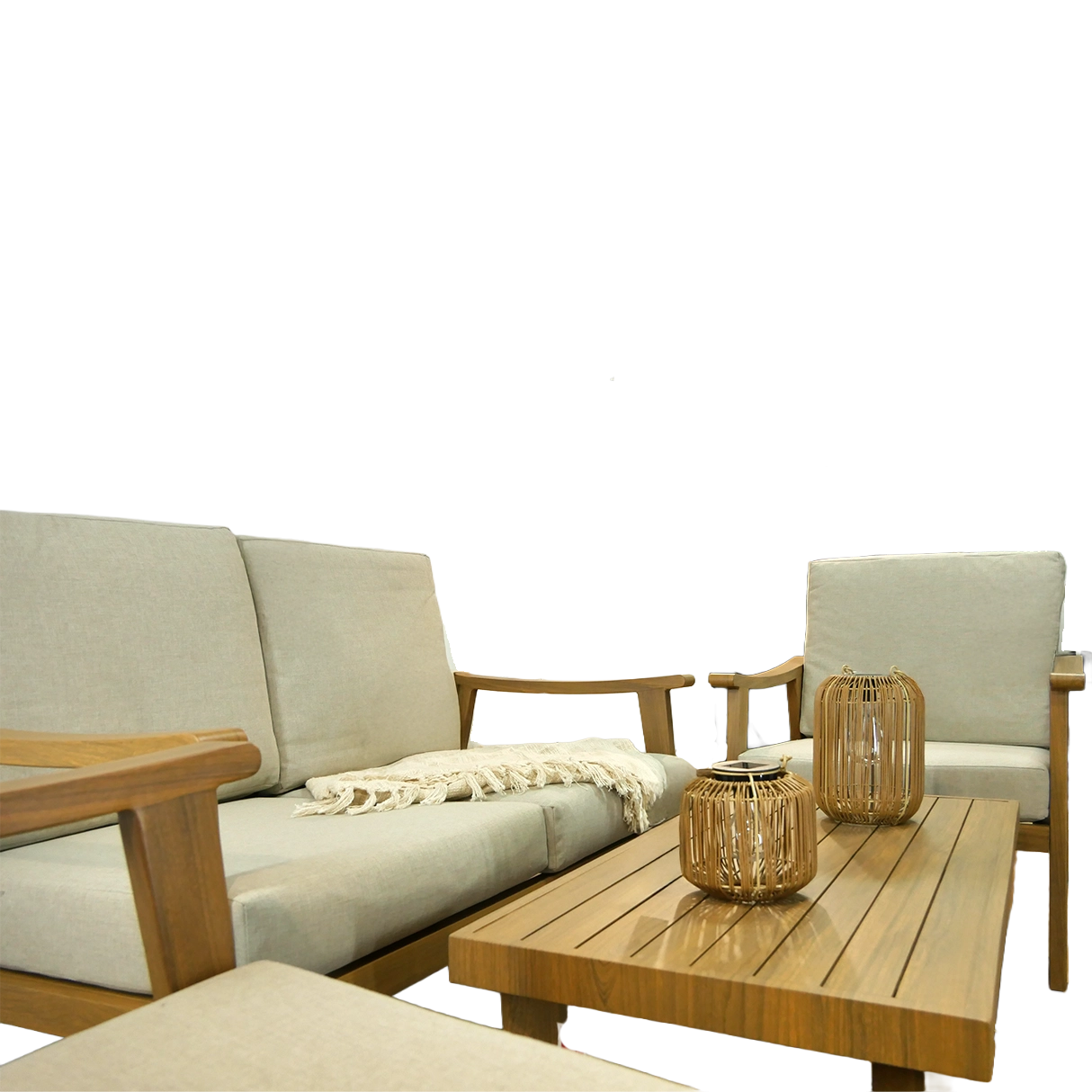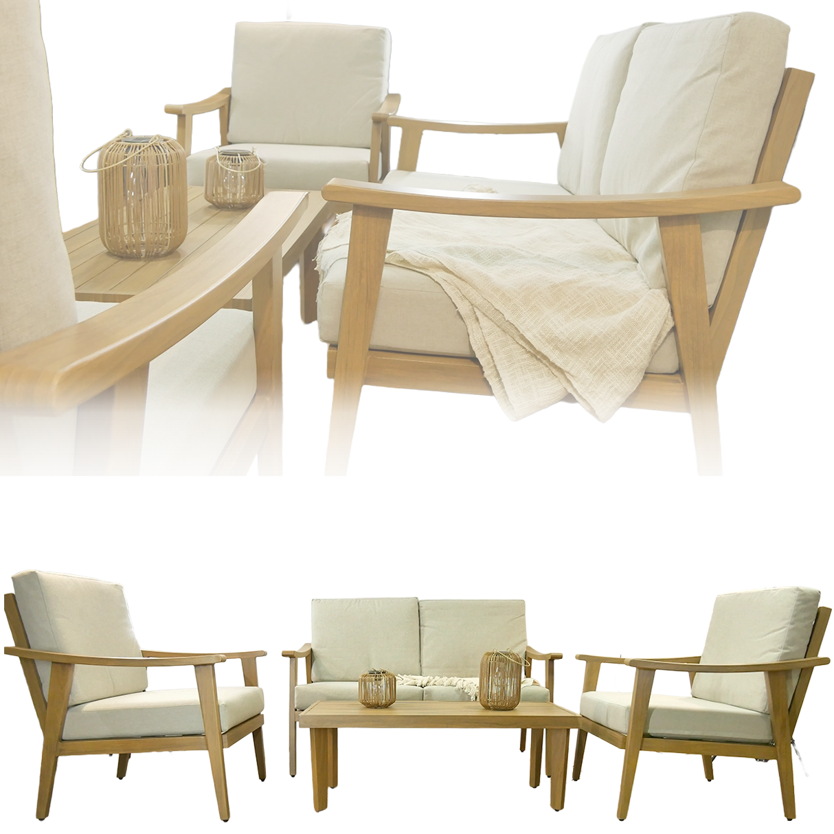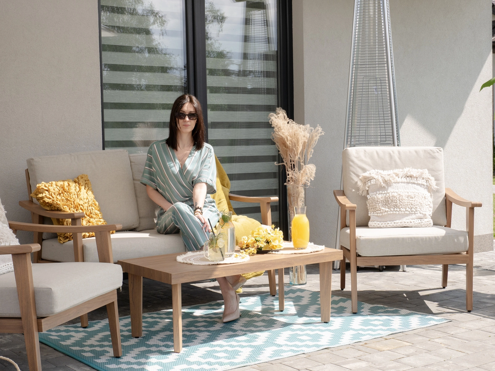 De elegante tuinmeubelserie TIRANA combineert modern design met hoge duurzaamheid. Het frame van poedergecoat aluminium met houtdecor is licht, stabiel en roestbestendig. Voor comfort zorgen de 10 cm dikke kussens in beige, terwijl de rugleuning van de bank is afgewerkt met stijlvolle koordbespanning. De set is perfect voor terras, balkon, tuin, prieel en serre.