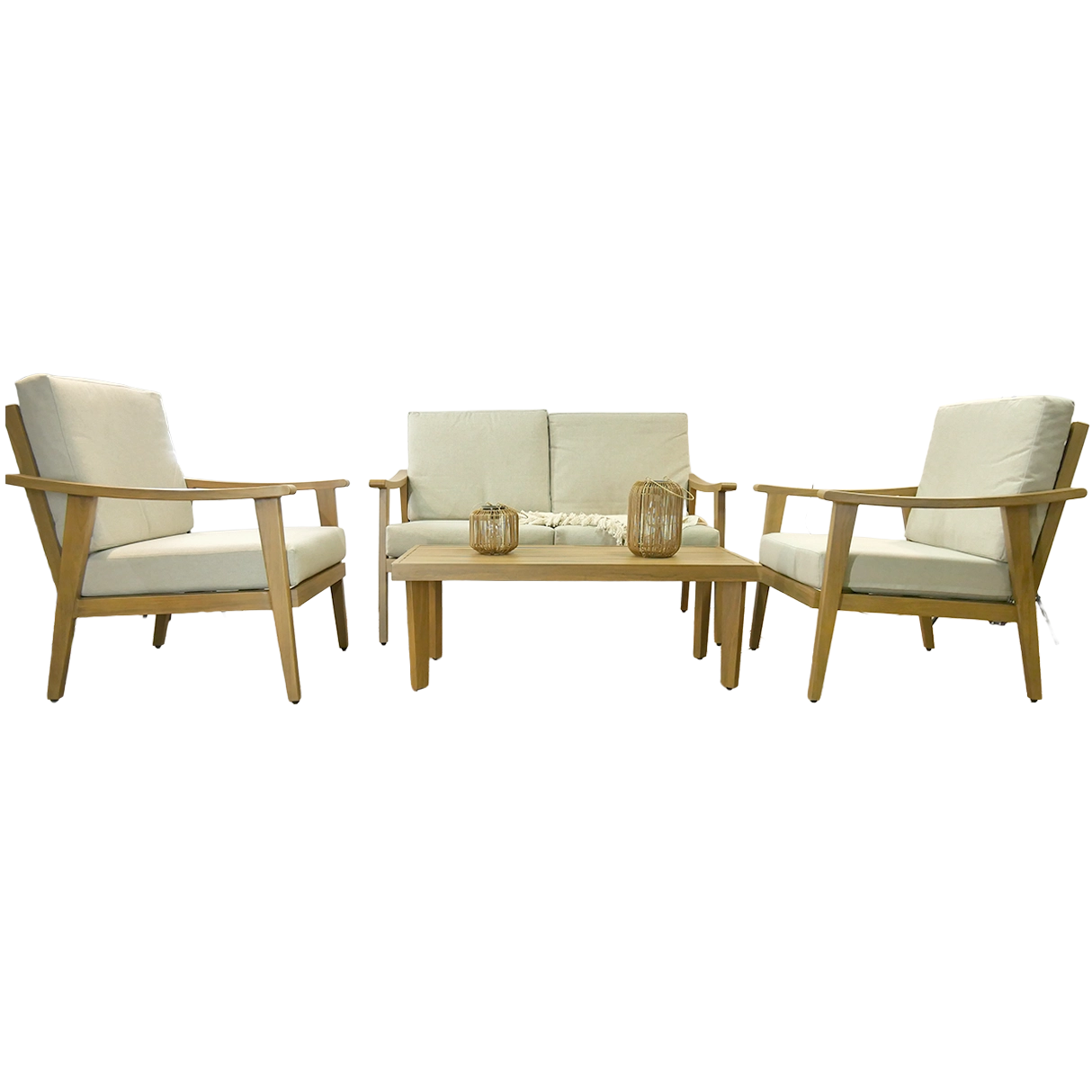 De set bestaat uit een tweepersoonsbank, 2 ruime fauteuils en een lage salontafel met een aluminium lamellenblad voor eenvoudig onderhoud. Dankzij de slijtvaste materialen is de set geschikt voor gebruik buitenshuis gedurende het hele seizoen en vereist hij minimaal onderhoud.