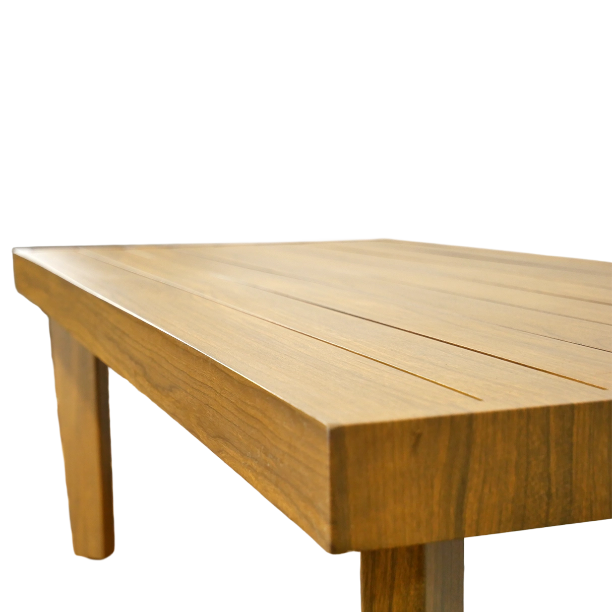De salontafel met een aluminium blad van lamellen is stabiel, weersbestendig en gemakkelijk schoon te maken – ideaal voor drankjes, hapjes en decoratie.