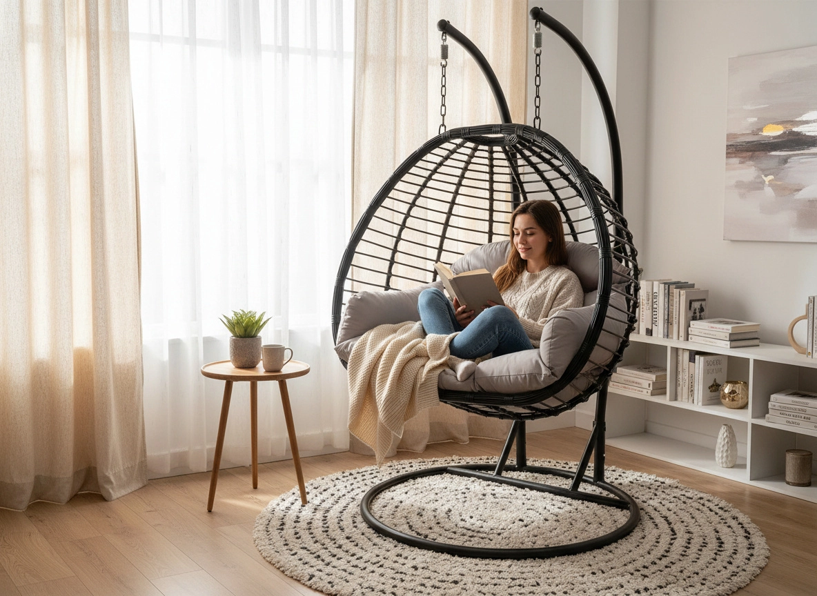 Geniet met z'n tweeën van ontspanning met de hangstoel GASPAR. De ruime zitting, een stabiele stalen constructie en een zacht, gevoerd kussen in een elegante grijze kleur zorgen voor comfort op het terras, in de tuin en binnenshuis. Het donkergrijze frame geeft een moderne uitstraling, terwijl hoogwaardige materialen een lange levensduur garanderen.