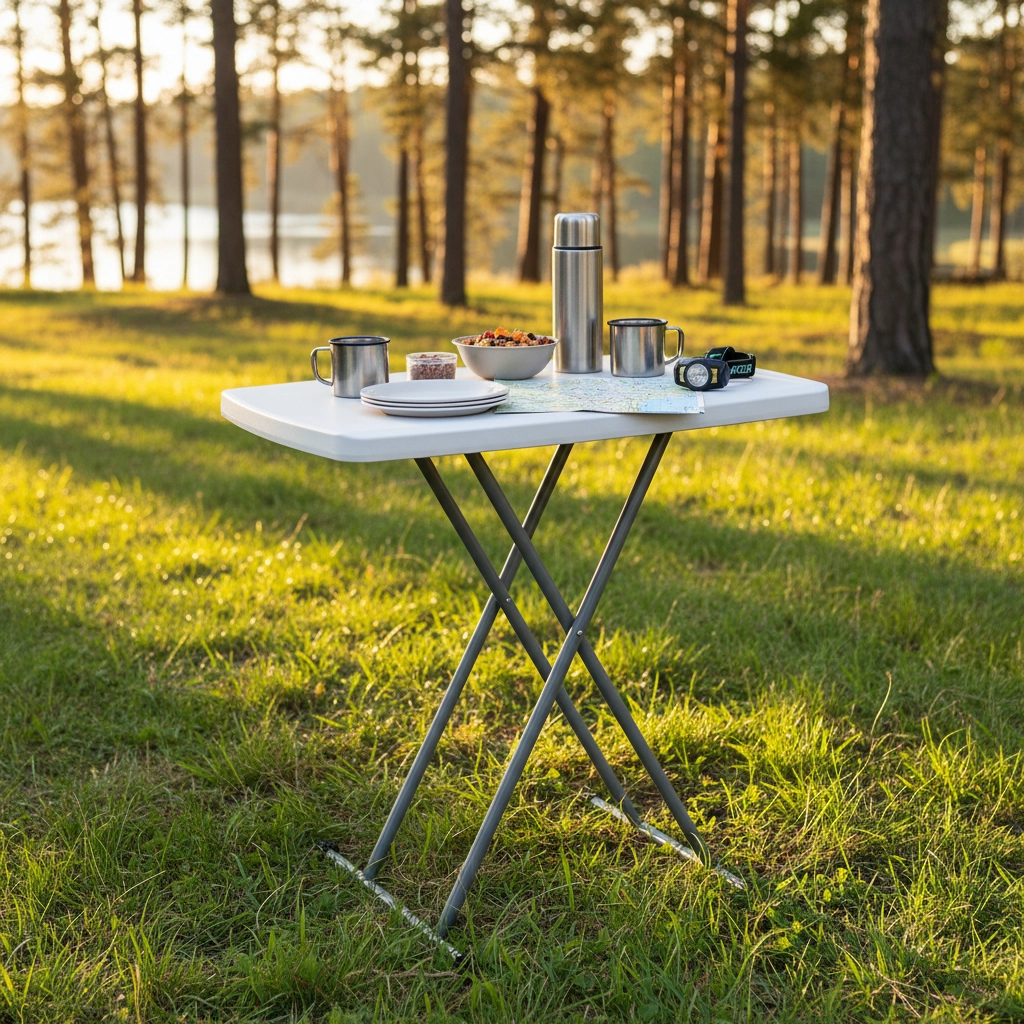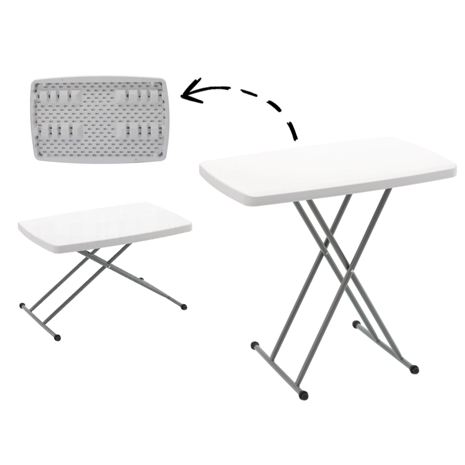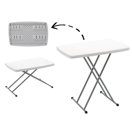 Dankzij het snelle inklappen is hij perfect voor kamperen, reizen met de camper, tuinbijeenkomsten en thuisgebruik als bijzettafel of werkoppervlak. Het duurzame witte blad is eenvoudig te reinigen en staat mooi zowel binnen als buiten.