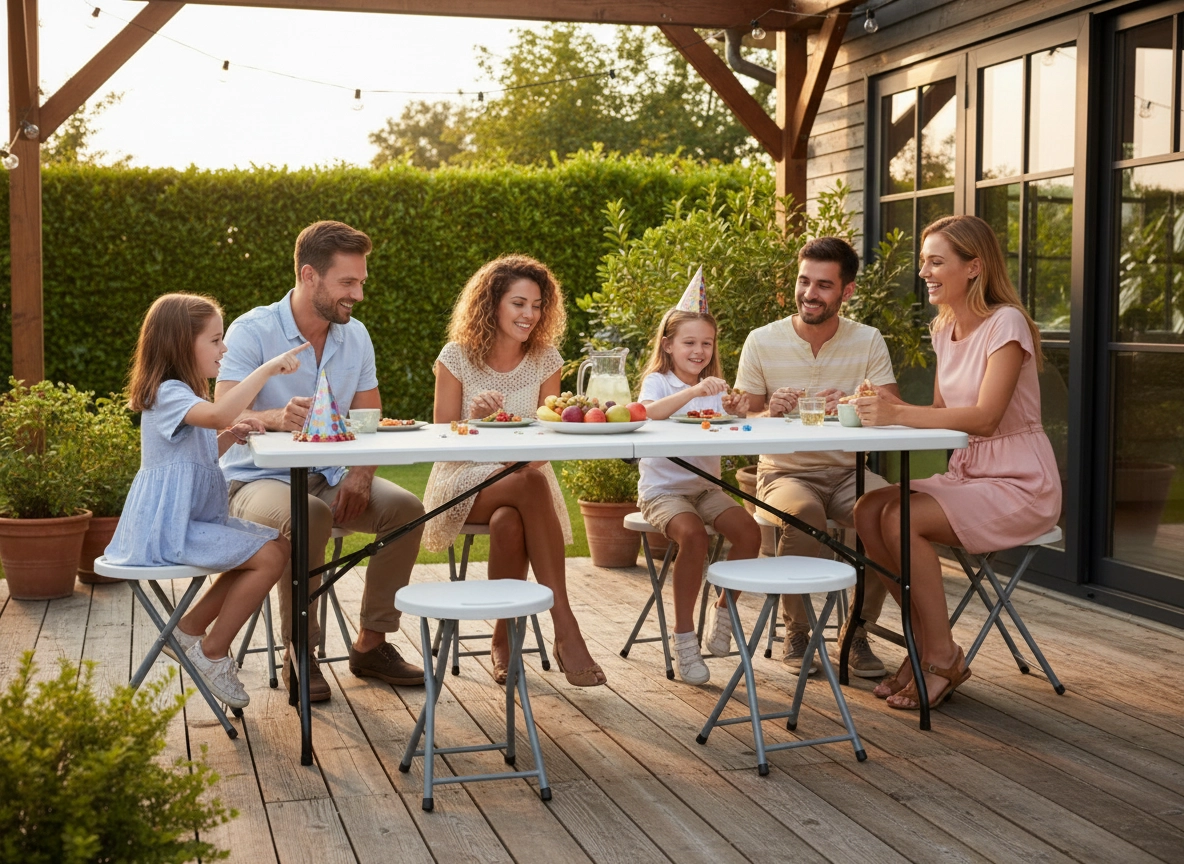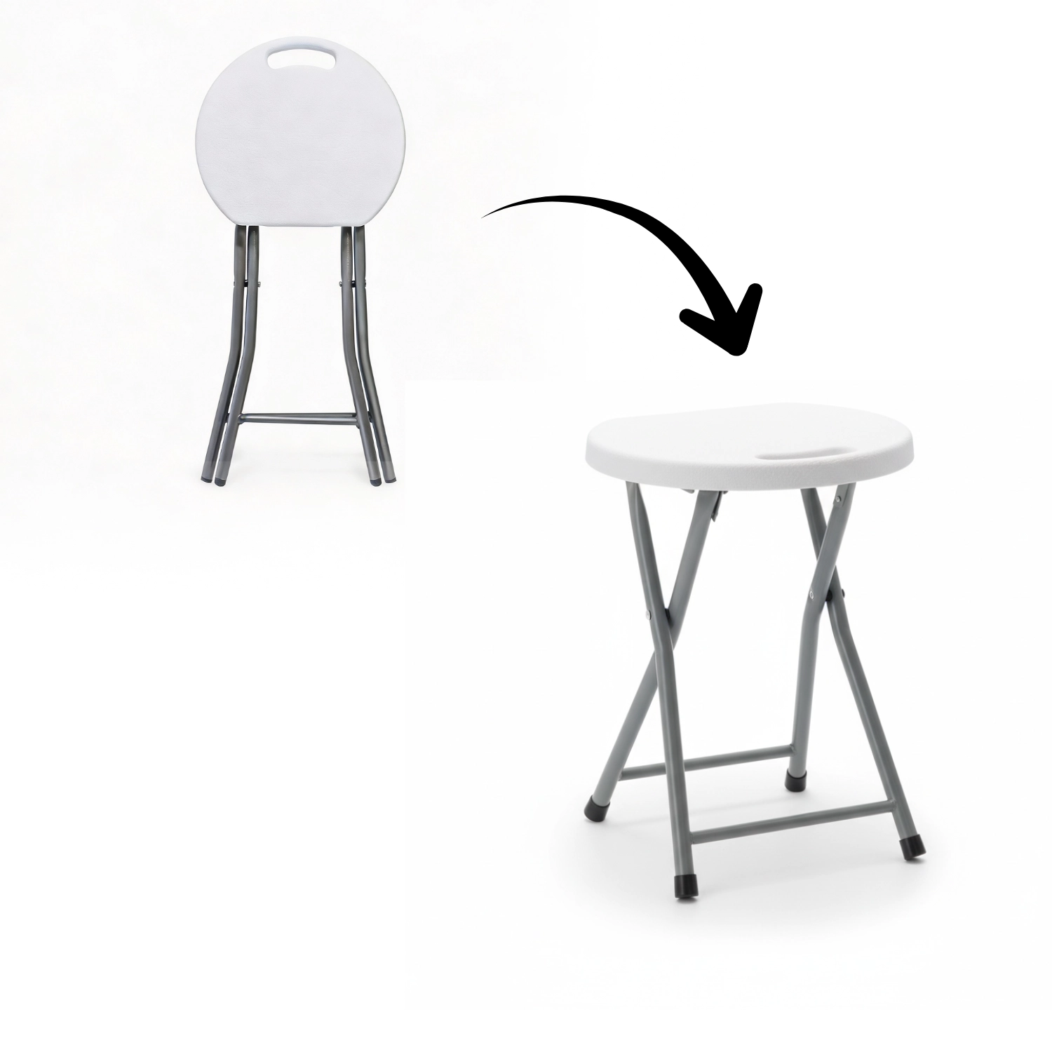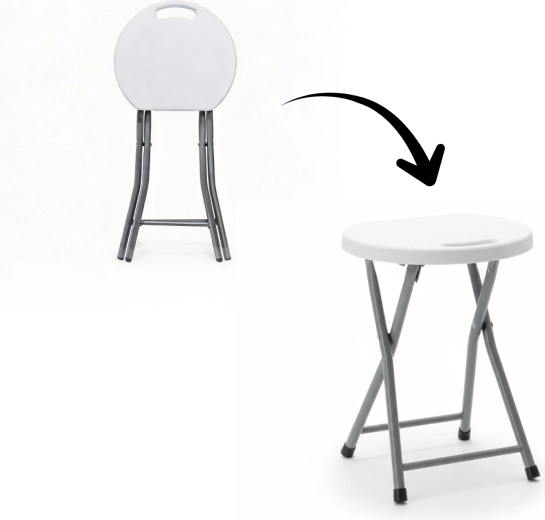 De kruk vouwt plat op voor eenvoudige opslag in de auto, caravan of kast. Ideaal als extra zitplaats.