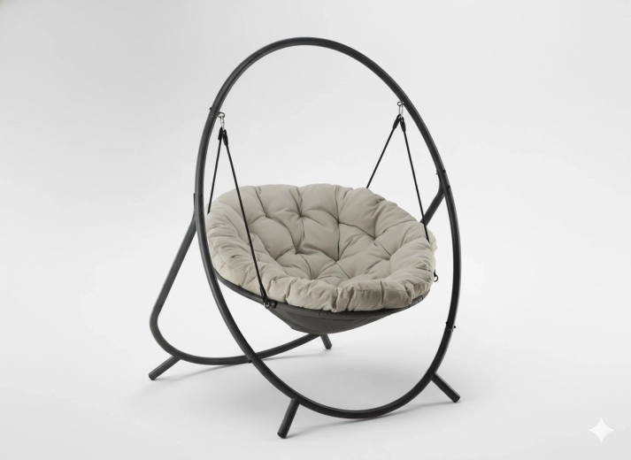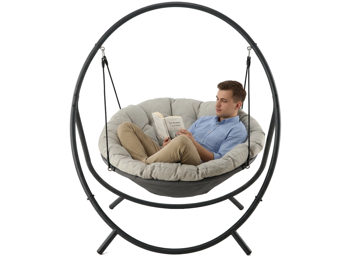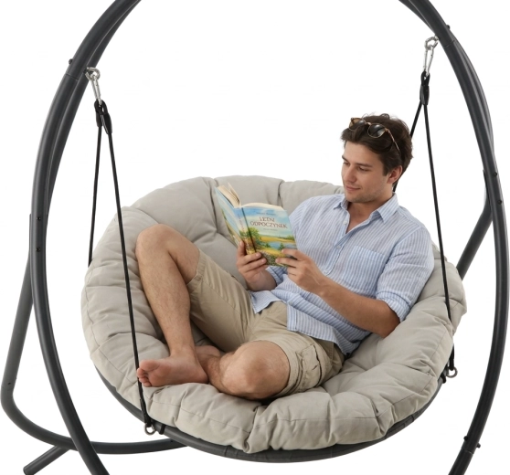 De elegante hangstoel met ruime ronde zitting tovert elk balkon, terras of tuin om tot een oase van rust. Het dik gevoerde beige kussen en de grijze metalen standaard vormen een tijdloze combinatie die past bij zowel een moderne als een natuurlijke stijl.