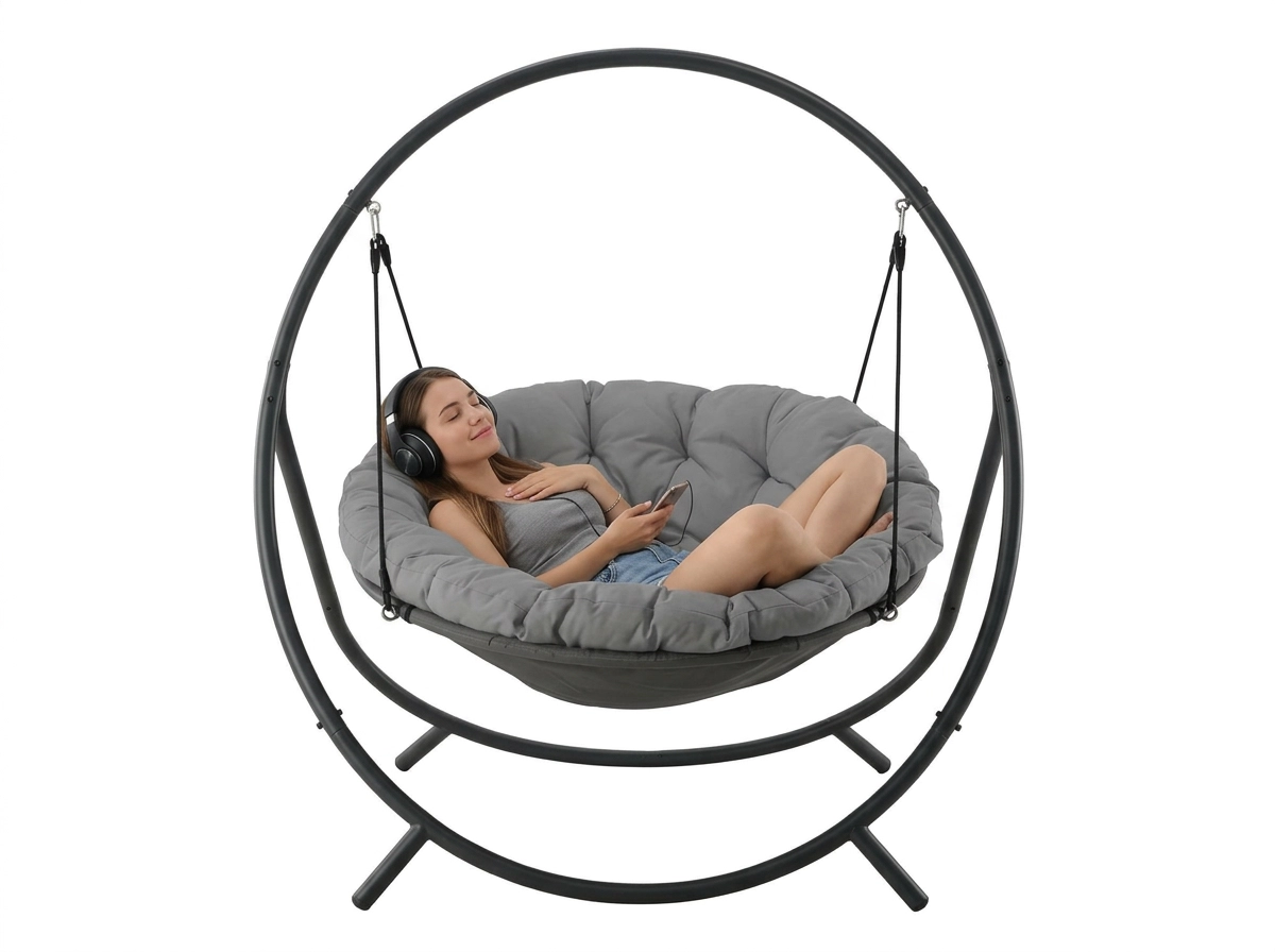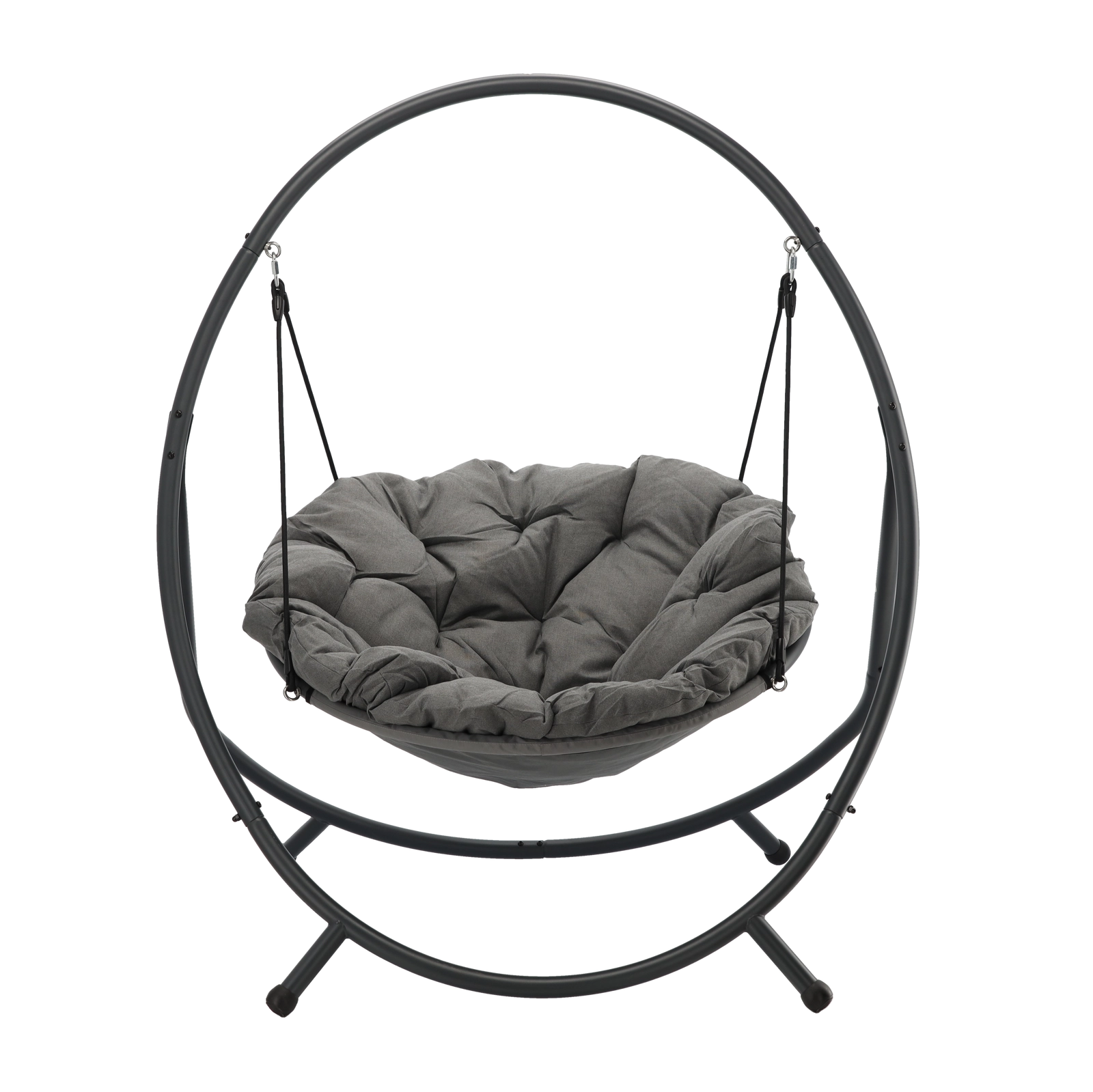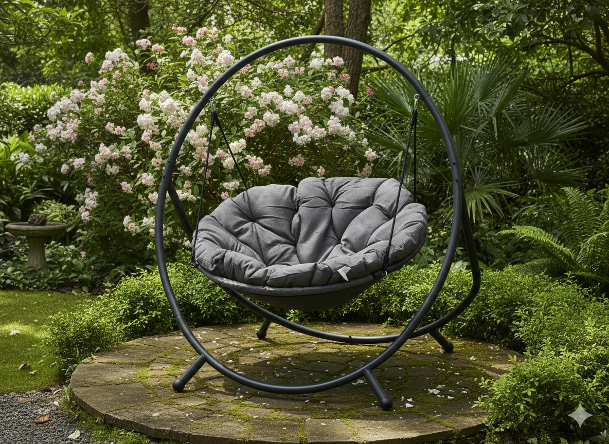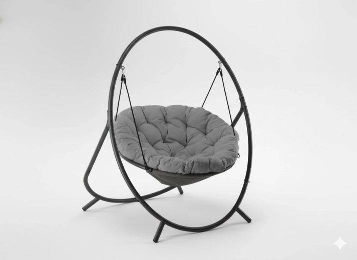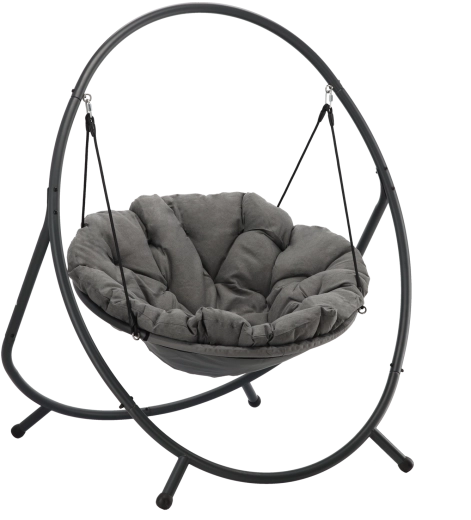 De hangstoel PATIO combineert een moderne grijze esthetiek met topcomfort. De robuuste stalen standaard met stabiele basis en hangbanden biedt veilig en soepel schommelen, terwijl de rijk gevoerde zitting in donkergrijs je aangenaam omarmt.