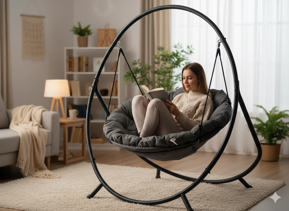 Het stabiele metalen frame met kruisbasis en duurzame hangbanden zorgt voor zekerheid en een vloeiende beweging, zonder in het plafond te hoeven boren.