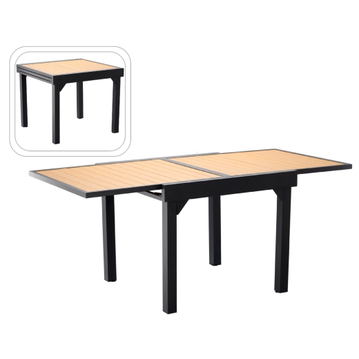Moderne uitschuifbare tuintafel met een duurzaam aluminium frame en een blad met houtdecor biedt een flexibele lengte van 90–180 cm. Dankzij het eenvoudige uitschuifmechanisme, het stabiele, poedergecoate frame en de makkelijke reiniging is hij ideaal voor terras, balkon en tuin. Maximale draagkracht 50 kg.