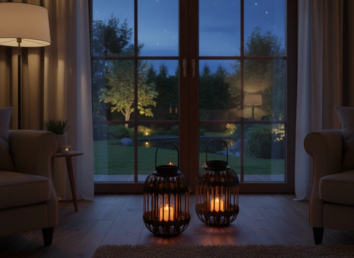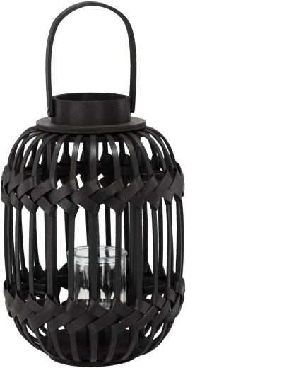 Stijlvolle lantaarn-kandelaar in het zwart die een metalen frame combineert met helder glas voor een sfeervolle lichtspreiding en een veilige plaatsing van de kaars. De open lamellen laten warm licht door en creëren prettige schaduwen voor avondlijke ontspanning, binnen én buiten.