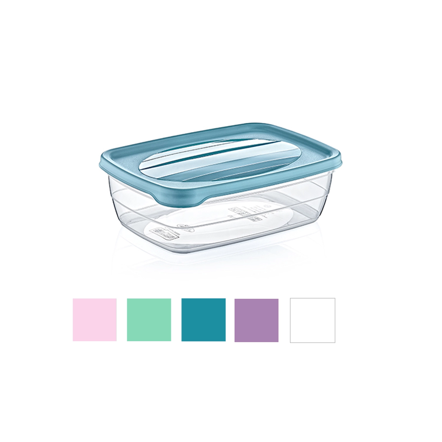 De rechthoekige vorm bespaart ruimte bij het stapelen. Kies uit verschillende dekselkleurvarianten en onderscheid de inhoud in één oogopslag.