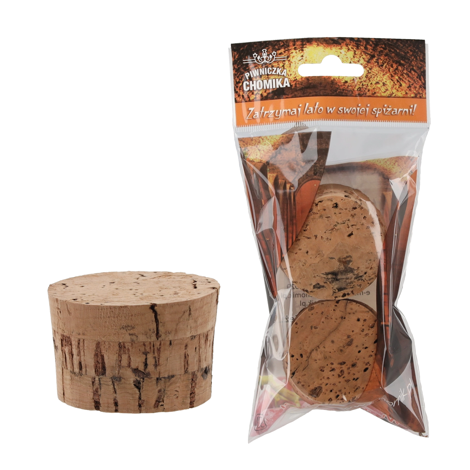Praktische set van twee ecologische kurken stoppers met een diameter van 55 mm, ideaal voor het afsluiten van 54 l dame-jeannes. De hoogwaardige afwerking zorgt voor een betrouwbare afdichting, beschermt de inhoud tegen oxidatie en externe invloeden en is veilig voor contact met levensmiddelen.