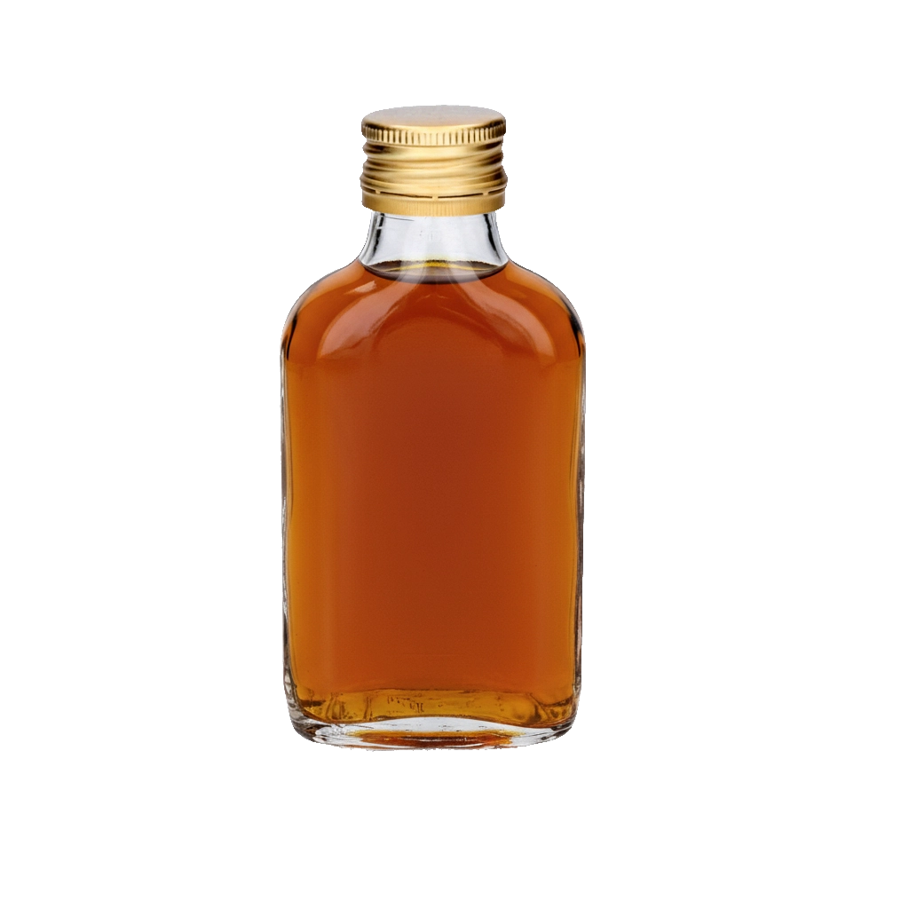 Deze compacte glazen platte fles combineert functionaliteit en stijl. Dankzij het stevige, heldere glas is ze duurzaam en hygiënisch, terwijl de gouden metalen schroefdop zorgt voor een betrouwbare lekvrije afsluiting. De inhoud van 100 ml is perfect voor proefseries, geschenksets of reisverpakkingen van favoriete dranken.