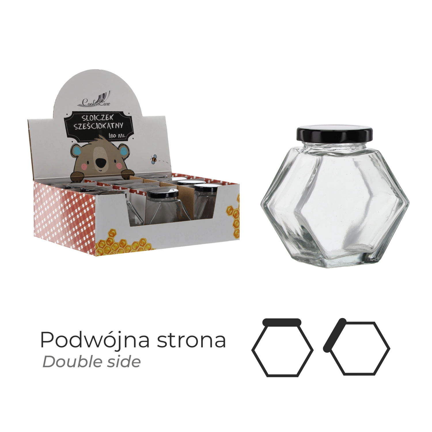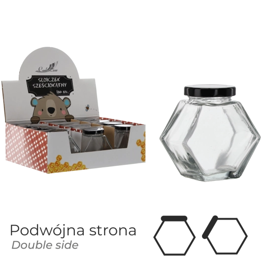 Universeel zeshoekig glazen potje met een inhoud van 180 ml, een uitstekende keuze voor zowel thuisgebruik als verkoop. Dankzij het goed afsluitende deksel blijft de inhoud betrouwbaar vers en worden geuren binnengehouden. De elegante vorm is praktisch in de voorraadkast en op de toonbank.