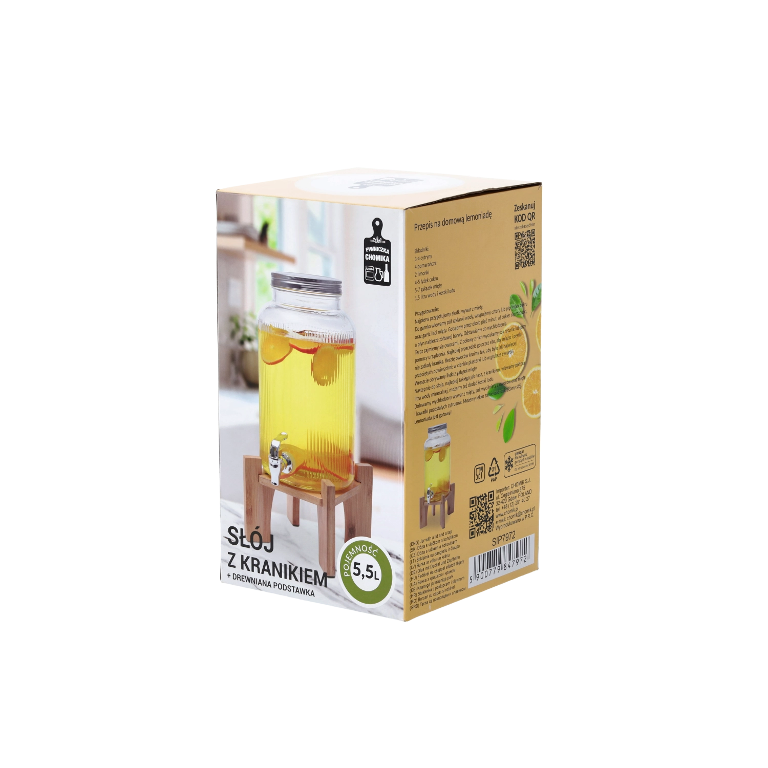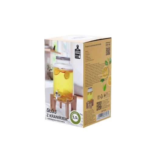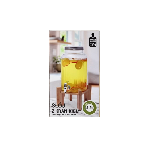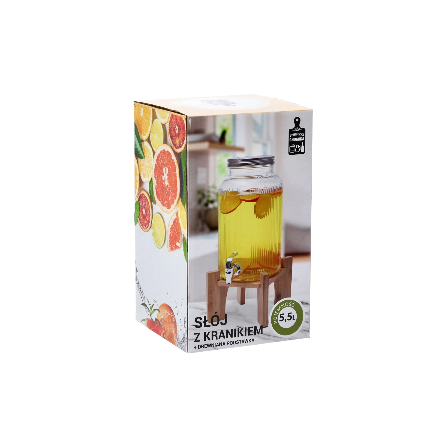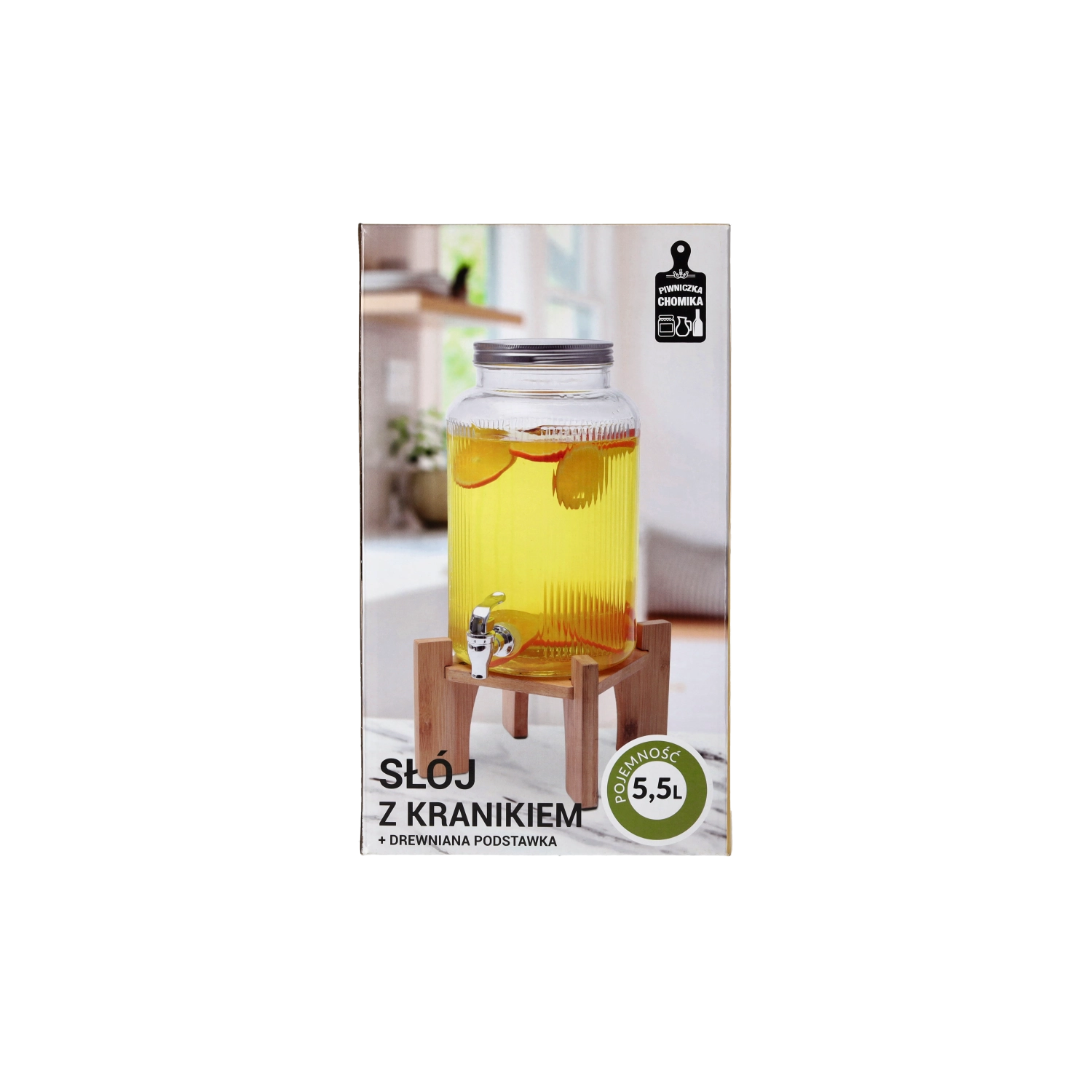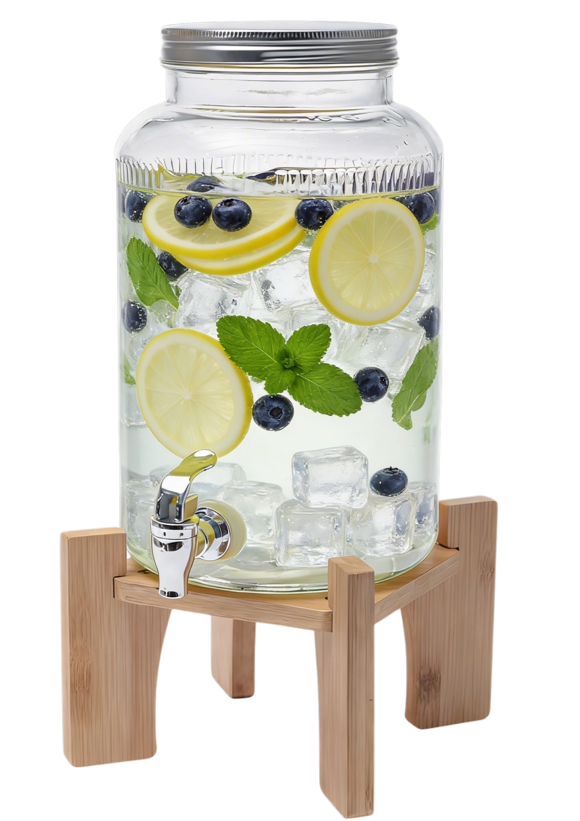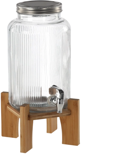 Stijlvolle glazen drankdispenser met een inhoud van 5,5 l en een houten standaard, ideaal voor het serveren van limonades, cocktails en huisgemaakte dranken op tuinfeesten, picknicks en familiefeestjes. Dankzij de brede opening voeg je eenvoudig fruit, ijs en kruiden toe en maak je alles na afloop gemakkelijk schoon. De kunststof kraan in zilverkleur zorgt voor nauwkeurig schenken zonder morsen en het metalen deksel beschermt de drank tegen vuil en insecten.