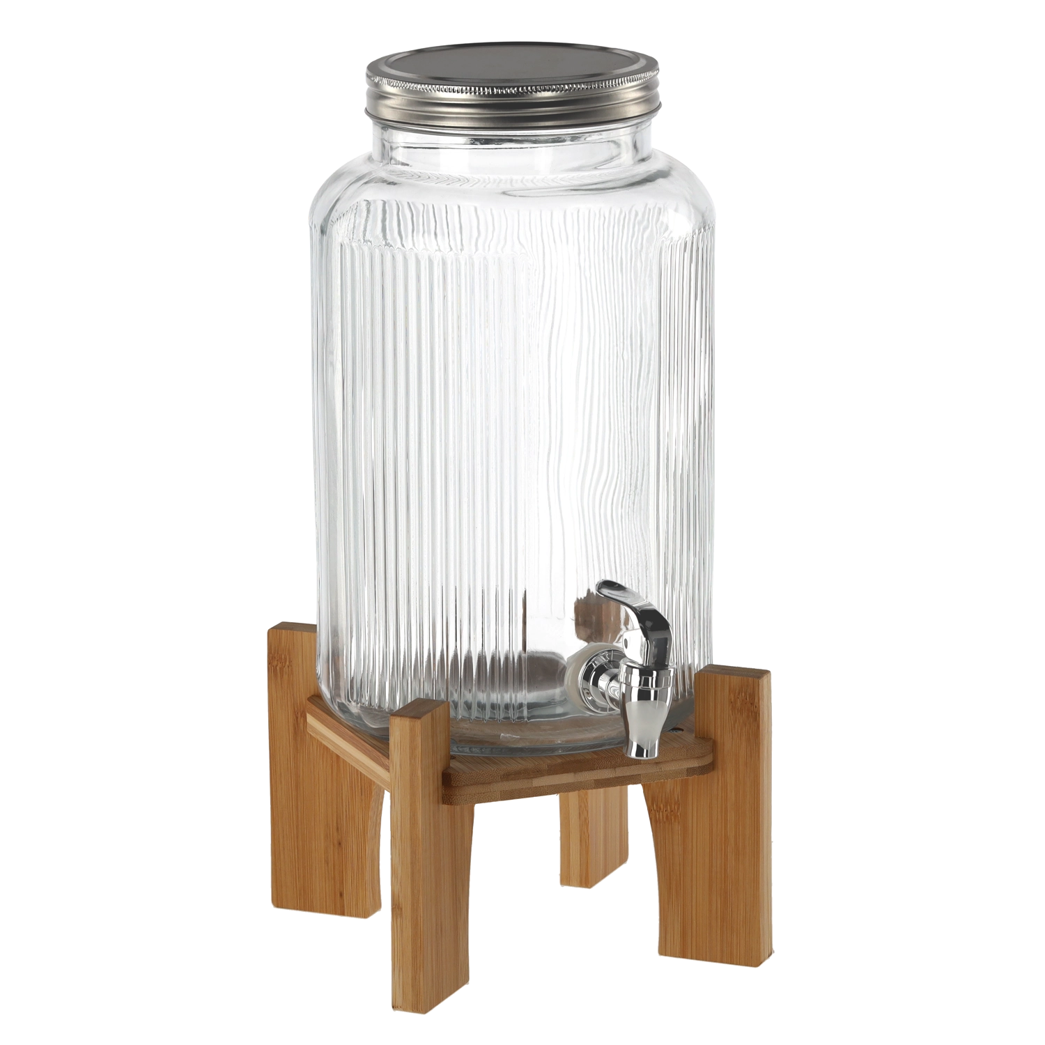 Deze elegante glazen dispenser met decoratieve ribbelstructuur biedt een aantrekkelijke presentatie van dranken en tegelijkertijd zicht op het vloeistofniveau. De stabiele houten standaard tilt de container tot een comfortabele hoogte voor het vullen van glazen, waardoor het bedienen snel en netjes gaat. Perfect voor zomerse limonades, fruitwaters, ijsthee en partycocktails.