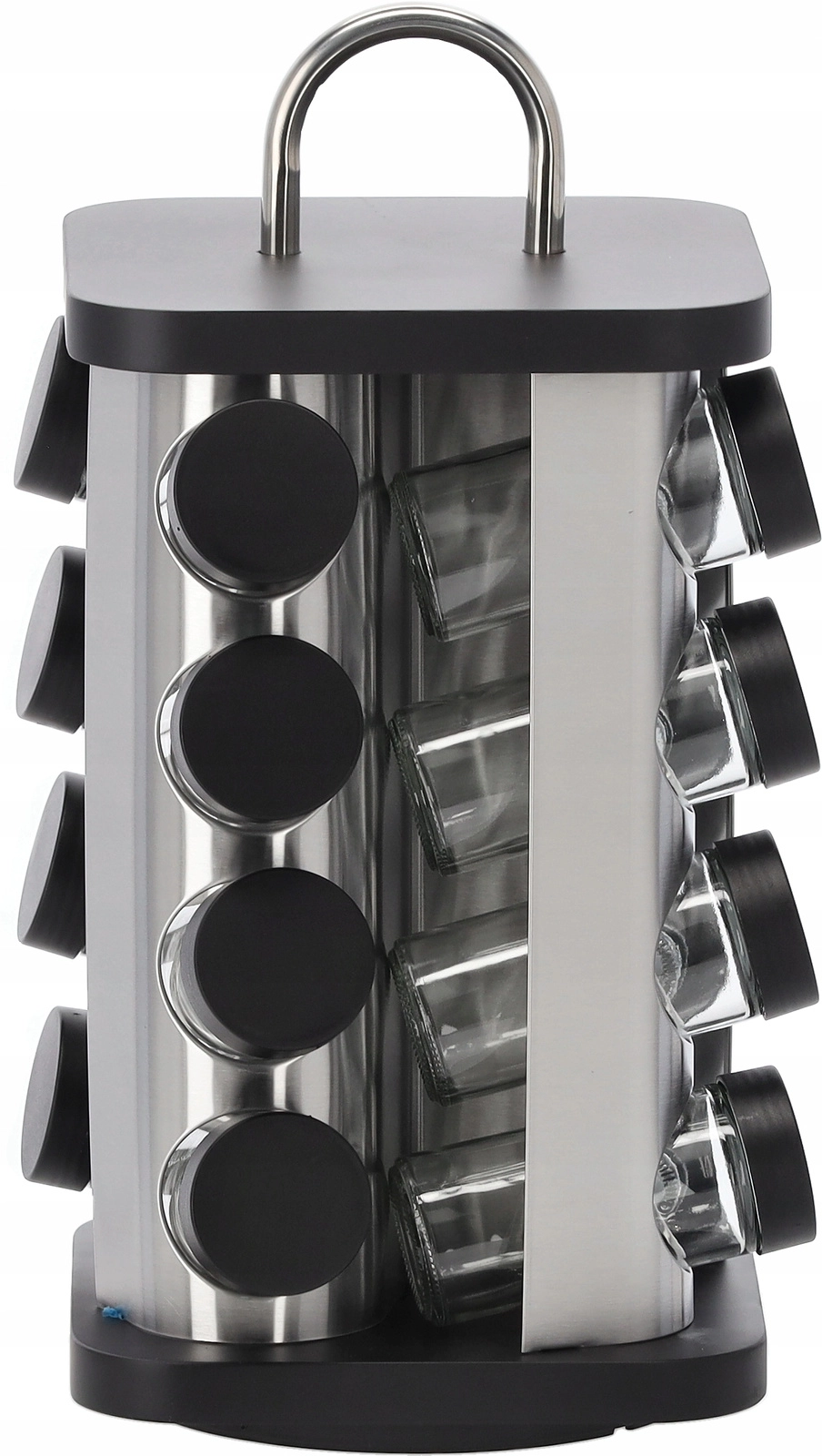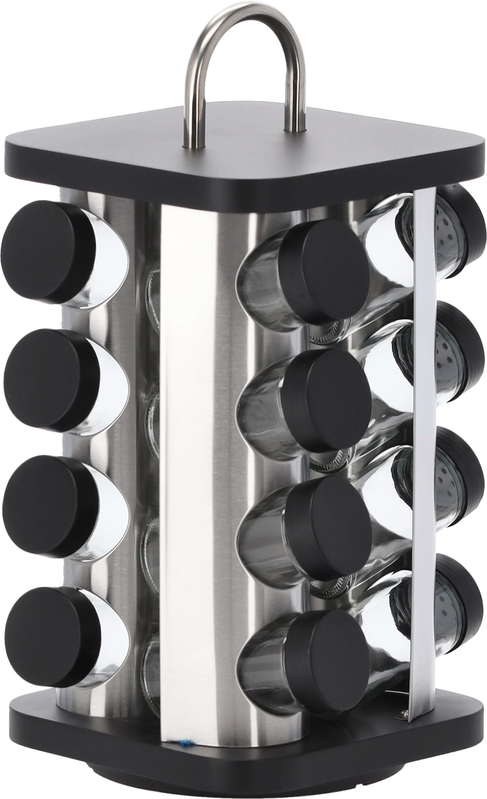 Elegante draaibare kruidenstandaard met een vierkante basis van 16,5 × 16,5 cm en een hoogte van 33,5 cm voor overzichtelijke en stijlvolle opslag van kruiden. Voorzien van een praktische handgreep voor eenvoudig dragen, inclusief 16 glazen potjes (90 ml) en vervaardigd uit duurzaam roestvrij staal met zwarte deksels. De draaiconstructie zorgt voor snelle toegang tot alle kruiden en de set wordt aangevuld met 38 stickers voor duidelijke labeling.