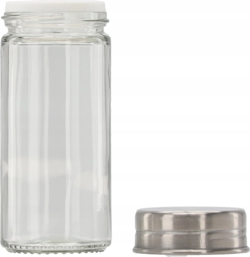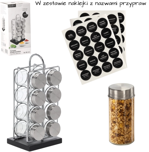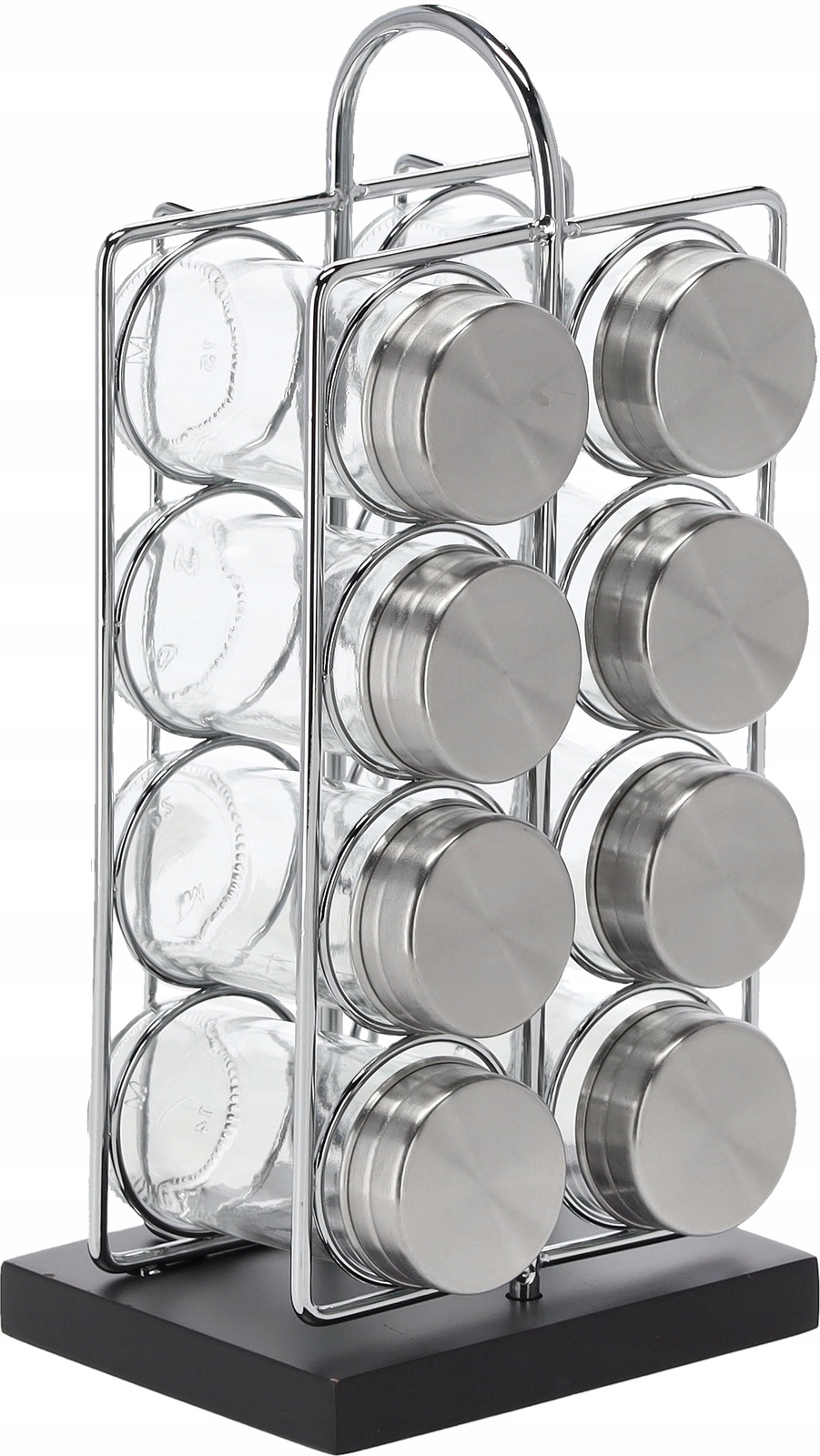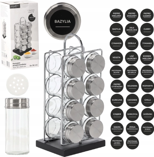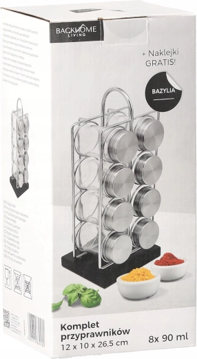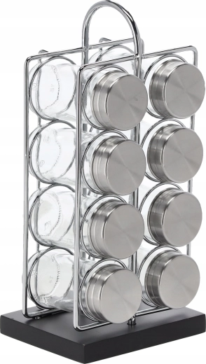 De set bevat 8 transparante glazen potjes (90 ml) met deksels van roestvrij staal. Ze zijn gerangschikt in 2 kolommen van 4 voor snelle toegang. De handgreep maakt het eenvoudig om het hele rek van het aanrecht naar de kookplaat of tafel te verplaatsen.