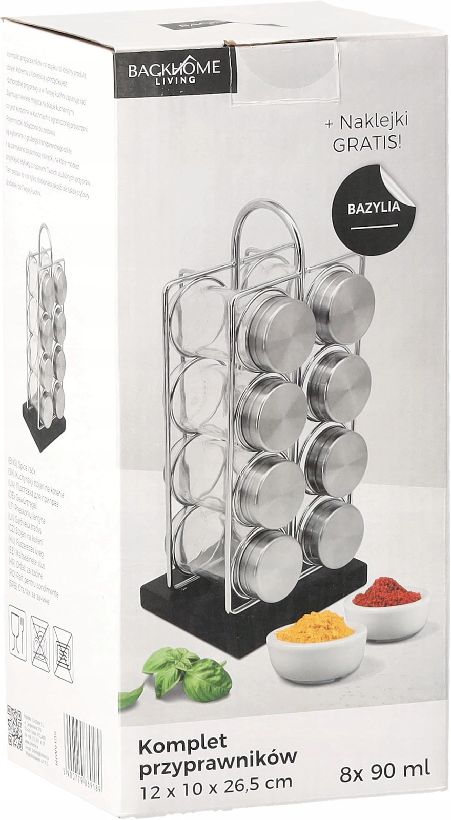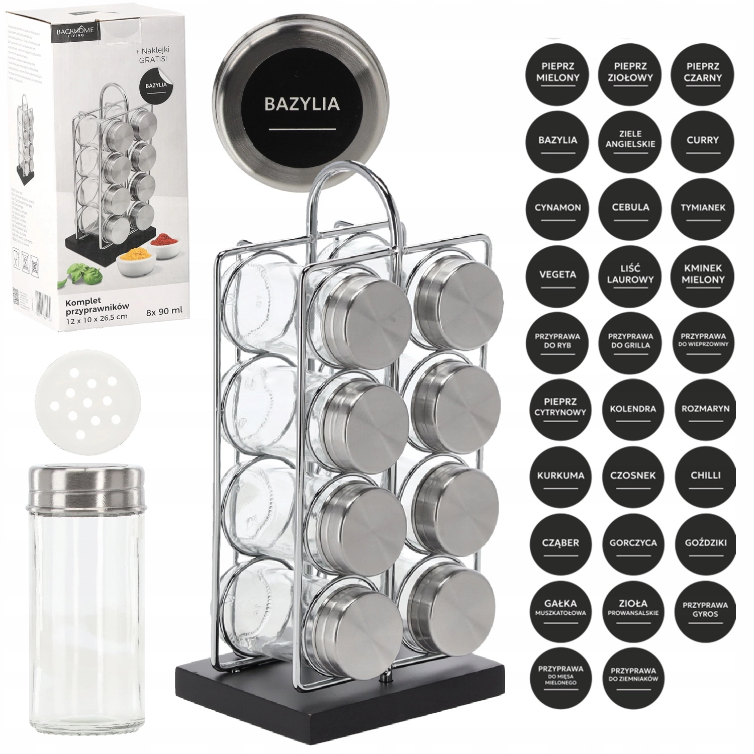 Stijlvol en praktisch kruidenrek voor dagelijks koken. Biedt een stevige stalen constructie met een MDF‑basis, 8 glazen kruidenpotjes (90 ml) met roestvrijstalen deksels en een comfortabele handgreep voor eenvoudig dragen. Inclusief 38 stickers met kruidennamen voor snelle oriëntatie en personalisatie.