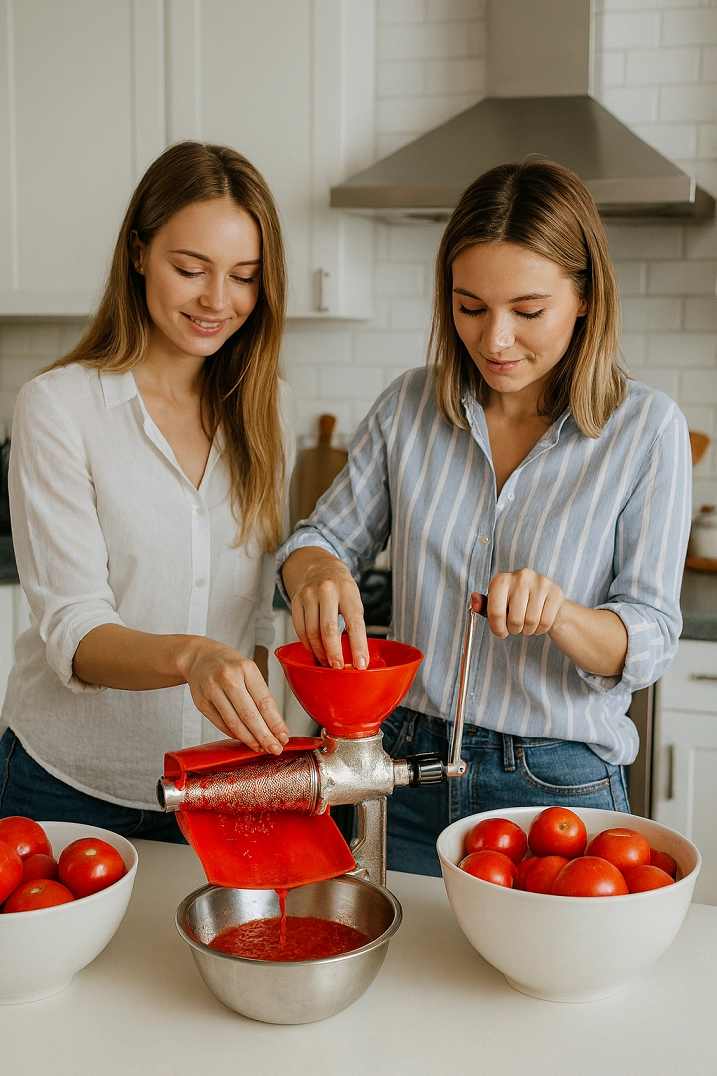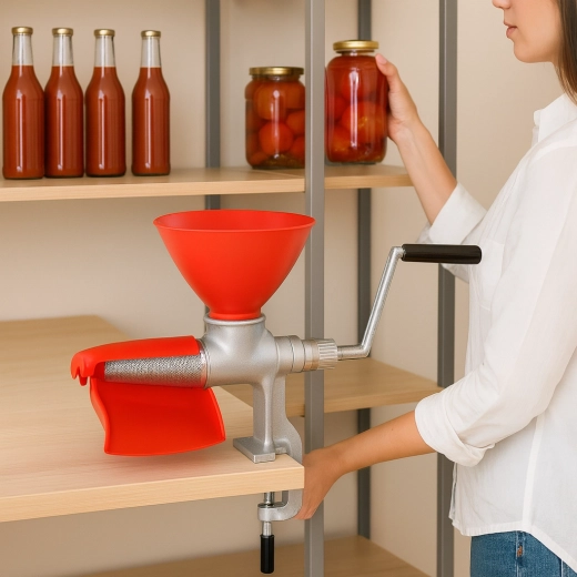 De geïntegreerde klem verankert de molen stevig aan het werkblad, zodat u comfortabel en veilig grotere hoeveelheden tomaten kunt verwerken zonder wegglijden.