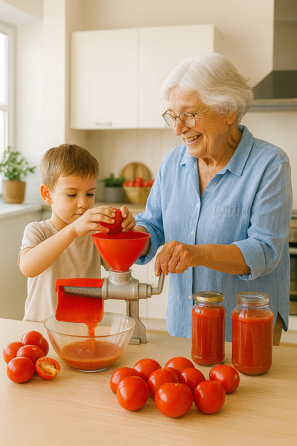 Ontdek een betrouwbare tomatenmolen die het thuis maken van sauzen, passata, soepen en babyhapjes makkelijker maakt. Gietijzer biedt een lange levensduur en stabiliteit, terwijl de kunststof trechter en uitloop het gebruikscomfort en onderhoudsgemak verhogen. Met de klem bevestigt u hem snel aan het aanrecht, zodat u kunt passeren zonder dat het apparaat verschuift.