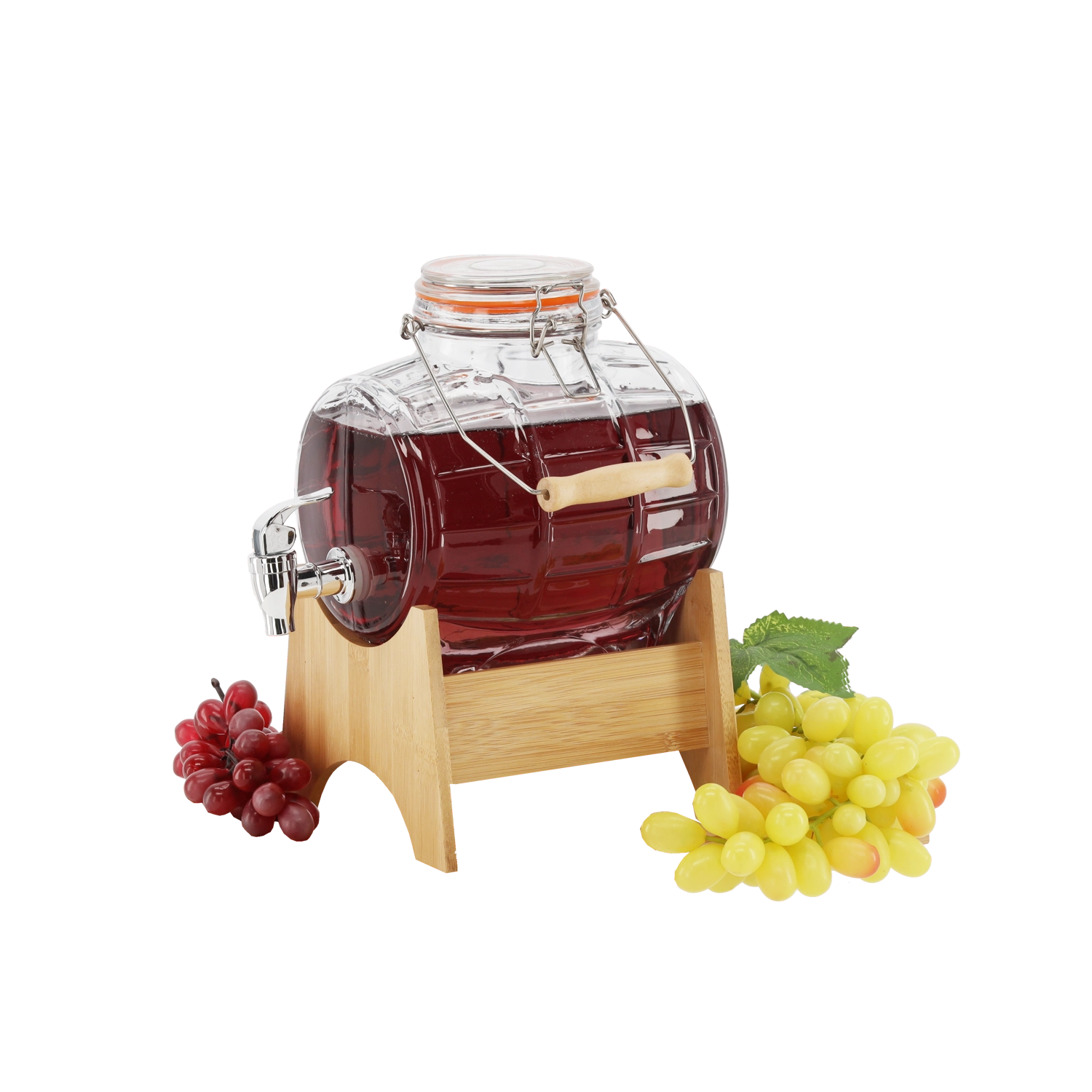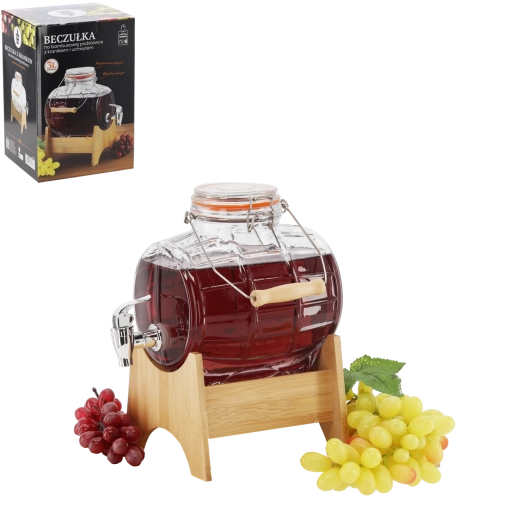 Stijlvol glazen vat met een inhoud van 3 liter, ideaal voor het serveren van wijn, bier, sappen en limonades. Biedt duurzaam dik glas, een praktische kunststof kraan voor soepel tappen en een mechanische beugelafsluiting met rubberen afdichting voor perfecte lekdichtheid. Inclusief een elegante bamboe standaard die zorgt voor stabiliteit en comfortabel gebruik thuis, op feestjes en bij bruiloften.