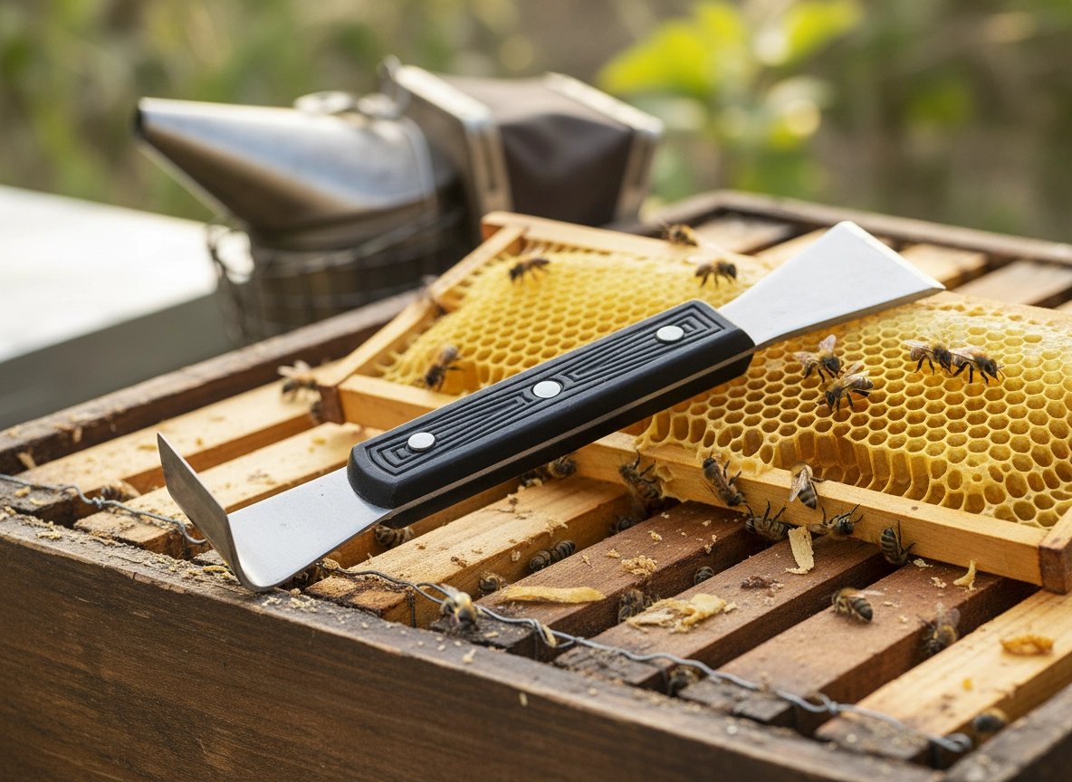 De speciaal gevormde haak vergemakkelijkt het loswrikken van aan elkaar gekitte ramen, terwijl het andere uiteinde effectief was en propolis van kastoppervlakken schraapt.