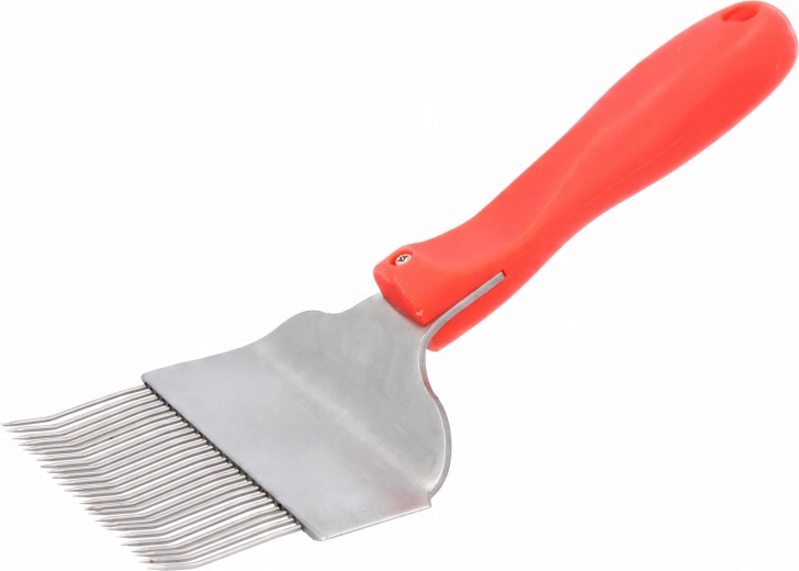 Praktische ontzegelvork voor honing met een comfortabel kunststof handvat en roestvrijstalen tanden voor snel en precies verwijderen van wasdeksels van ramen. Duurzame, scherpe punten zorgen voor efficiënte verwerking van honingraten en gemakkelijk reinigen. Een ideale hulp voor elke bijenstal.