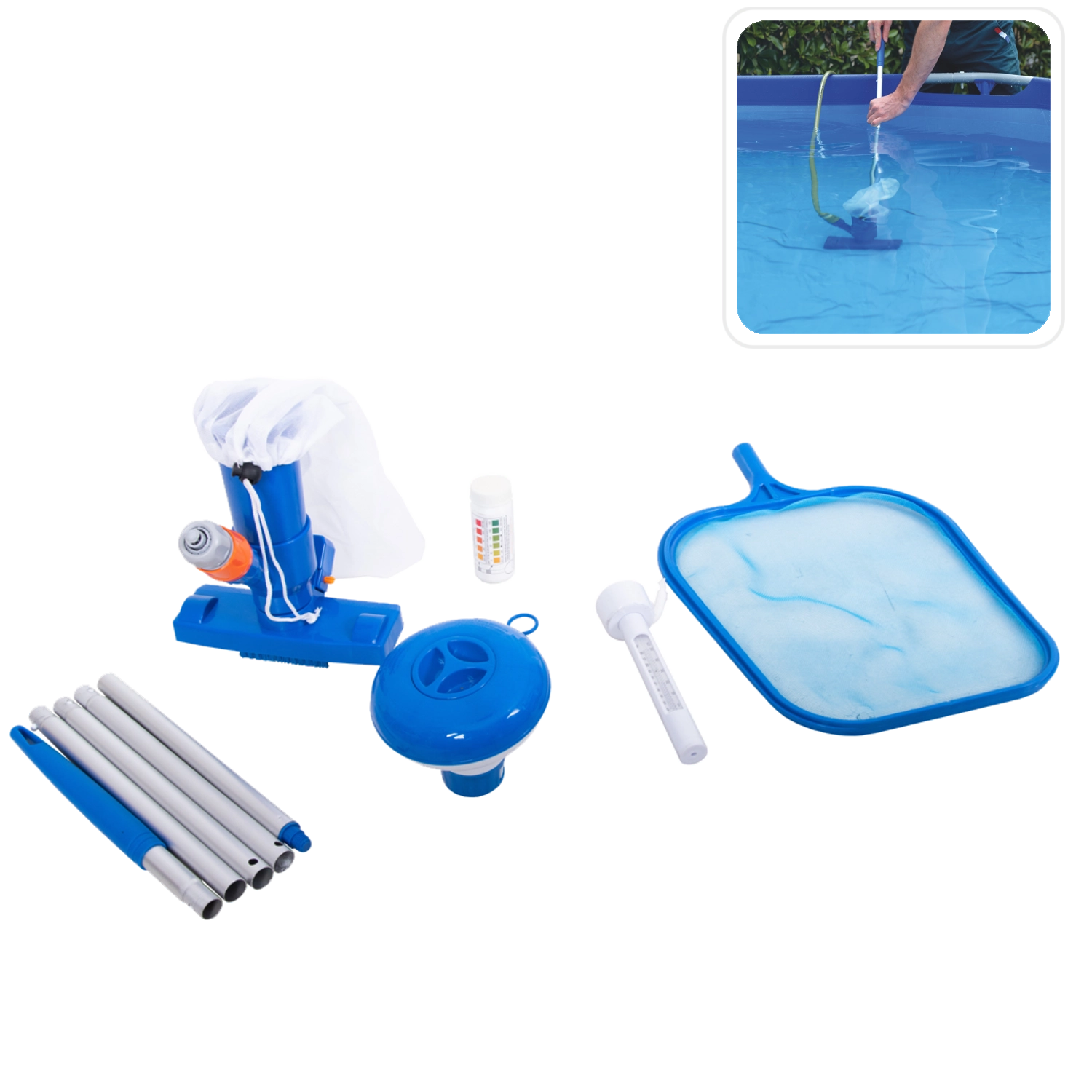Complete set voor zwembadonderhoud die het dagelijkse verzorging van water en wanden vereenvoudigt. Bevat een drijvende chemiedispenser, thermometer, 3-in-1 teststrips, zwembadstofzuiger, opvangnet en een telescoopsteel van 122 cm. Ideaal voor het snel verwijderen van bladeren, het reinigen van de bodem en het tussentijds controleren van de waterkwaliteit.