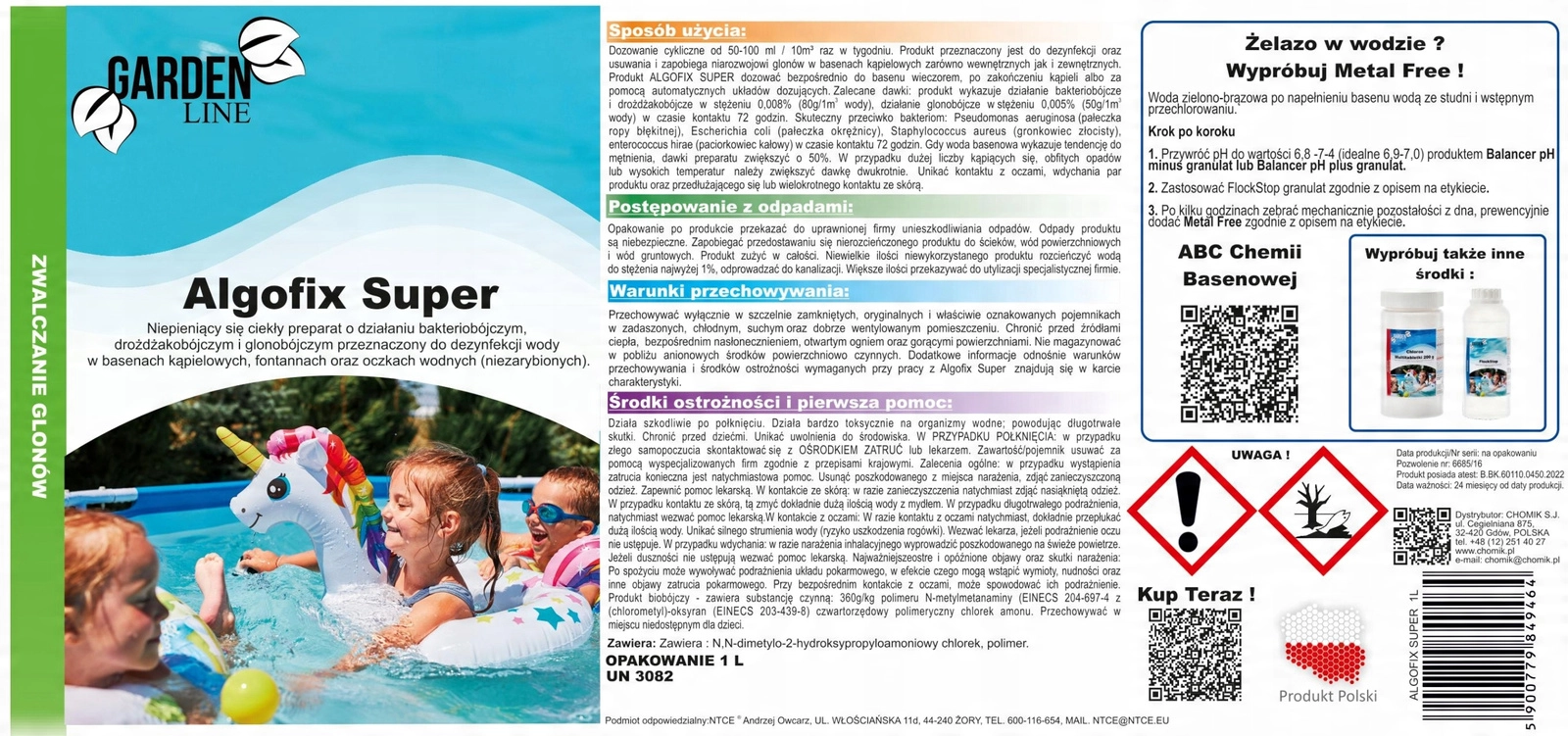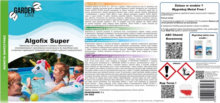 Algofix Super is een modern, niet-schuimend vloeibaar middel voor de complete desinfectie van zwembadwater. Het vernietigt effectief algen, bacteriën en gisten, houdt het water kristalhelder en veilig in buiten- en binnenzwembaden, fonteinen en visloze siervijvers. Ideaal ook bij hoge temperaturen en intensief gebruik zonder schuimvorming.