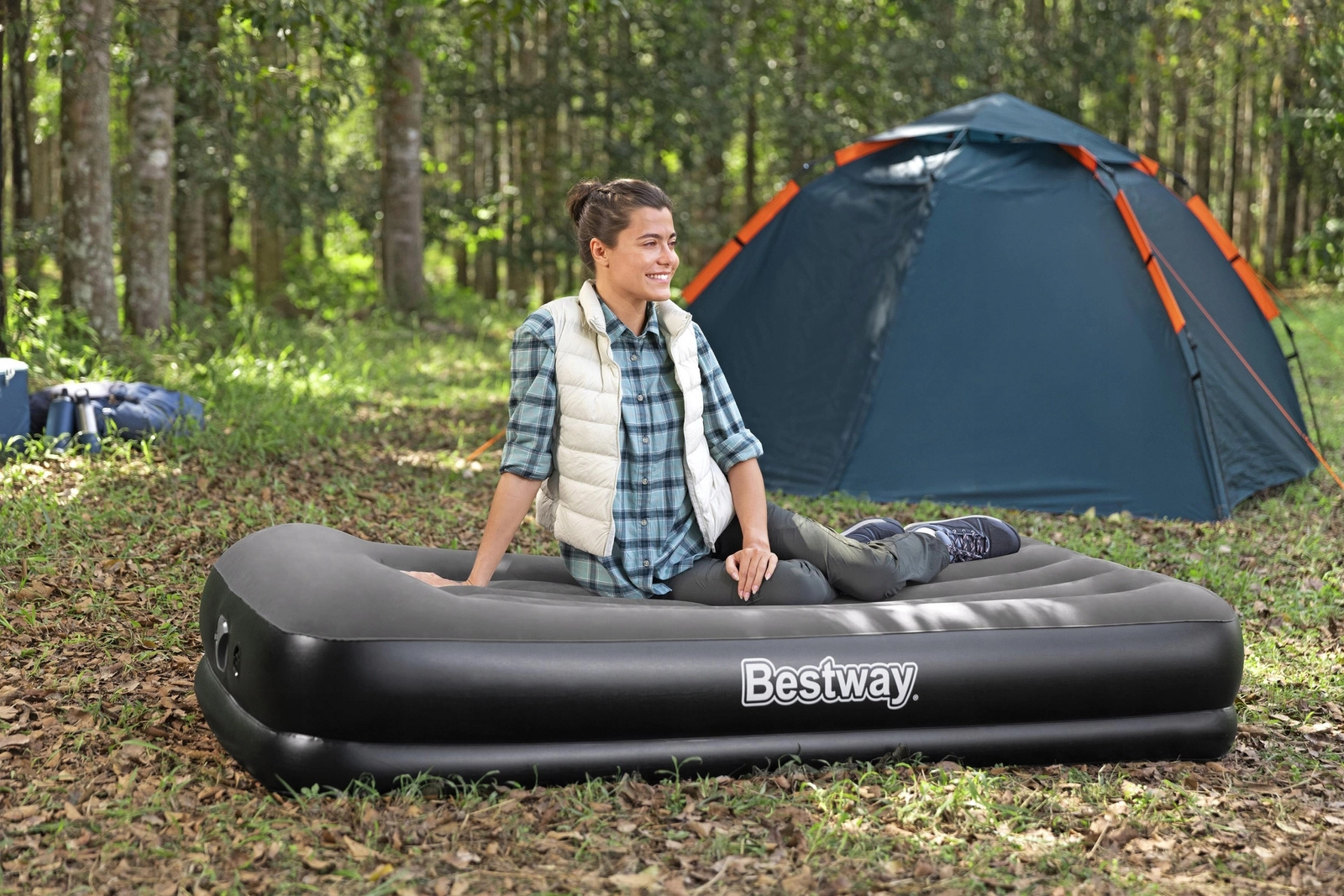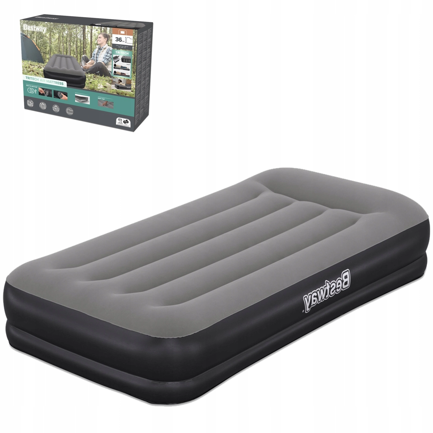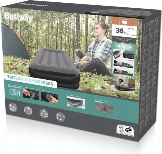 Het opblaasbare bed BESTWAY TRITECH combineert stabiliteit en comfort. De drielaagse Tritech-kern met met PVC versterkt polyestergaas zorgt voor langdurige vormvastheid, minder luchtafvoer gedurende de nacht en een prettige, stevige ondersteuning van het lichaam. Het verhoogde profiel van 36 cm vergemakkelijkt het opstaan en isoleert beter tegen koude vloeren.