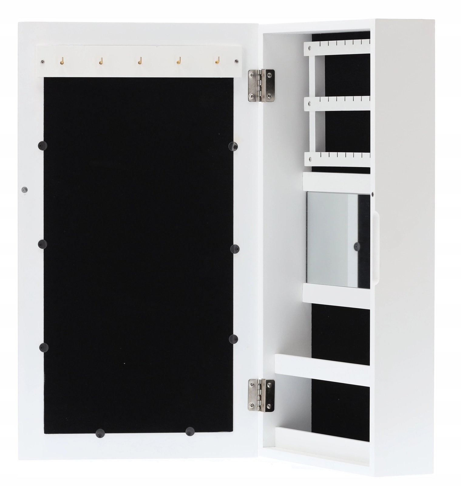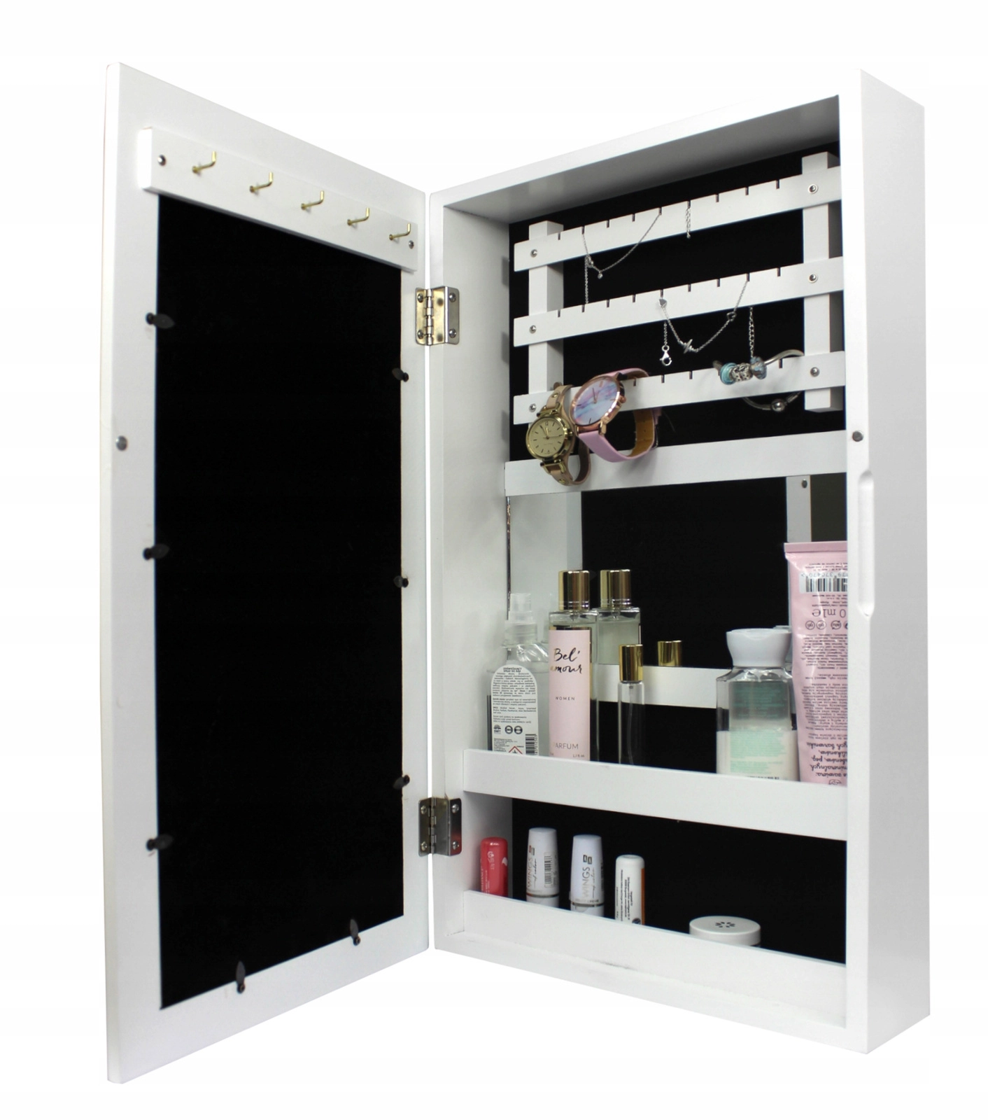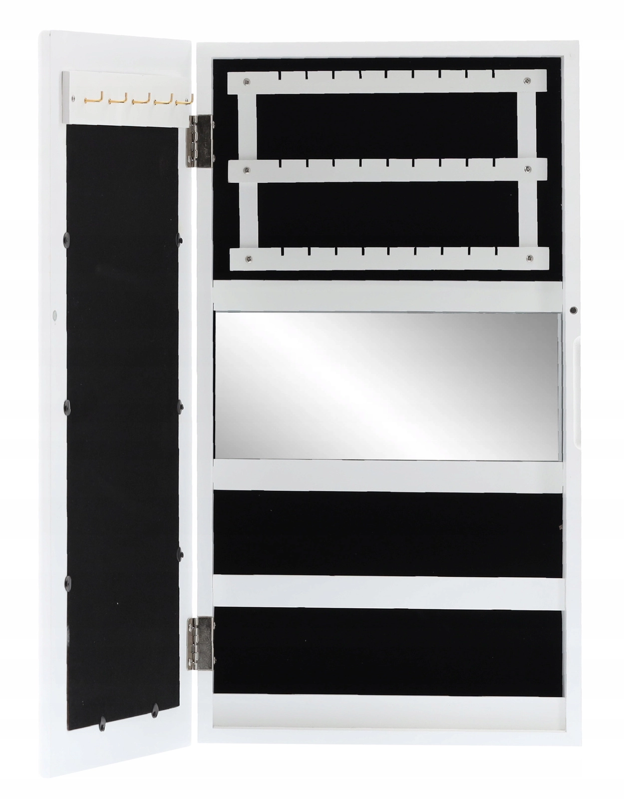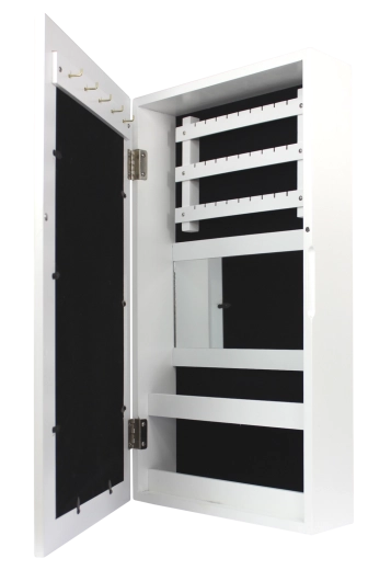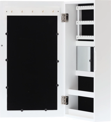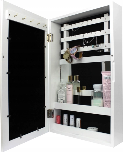 Elegante wandgemonteerde sieradenkast in het wit houdt al je schatten overzichtelijk op één plek. Binnenin vind je haakjes voor kettingen en armbanden, rails voor oorbellen, zachte rijen voor ringen en horloges, praktische plankjes en een ingebouwde spiegel. Zwarte fluwelen bekleding beschermt sieraden tegen krassen, de compacte afmetingen besparen ruimte en het moderne, tijdloze design past in elk interieur.