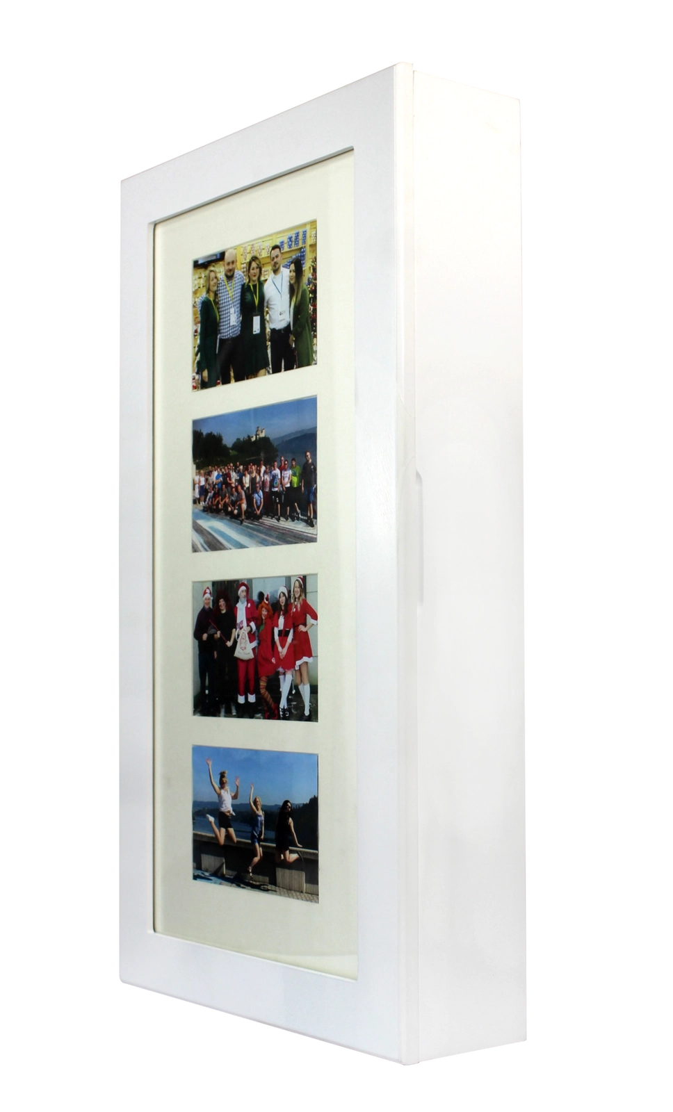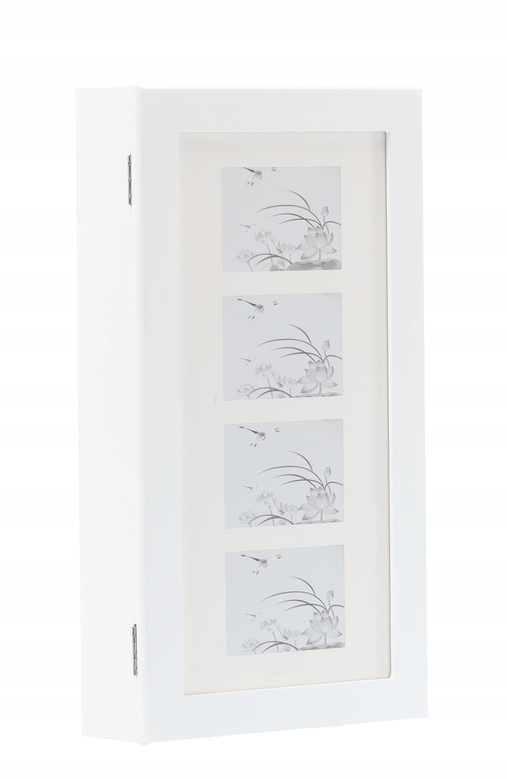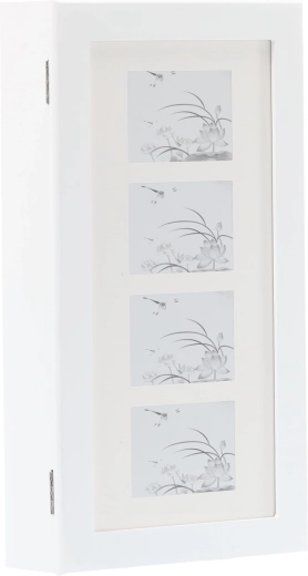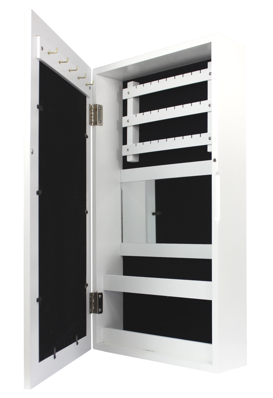 Elegante wandgemonteerde sieradenkast in het wit houdt al je schatten overzichtelijk op één plek. Binnenin vind je haakjes voor kettingen en armbanden, rails voor oorbellen, zachte rijen voor ringen en horloges, praktische plankjes en een ingebouwde spiegel. Zwarte fluwelen bekleding beschermt sieraden tegen krassen, de compacte afmetingen besparen ruimte en het moderne, tijdloze design past in elk interieur.