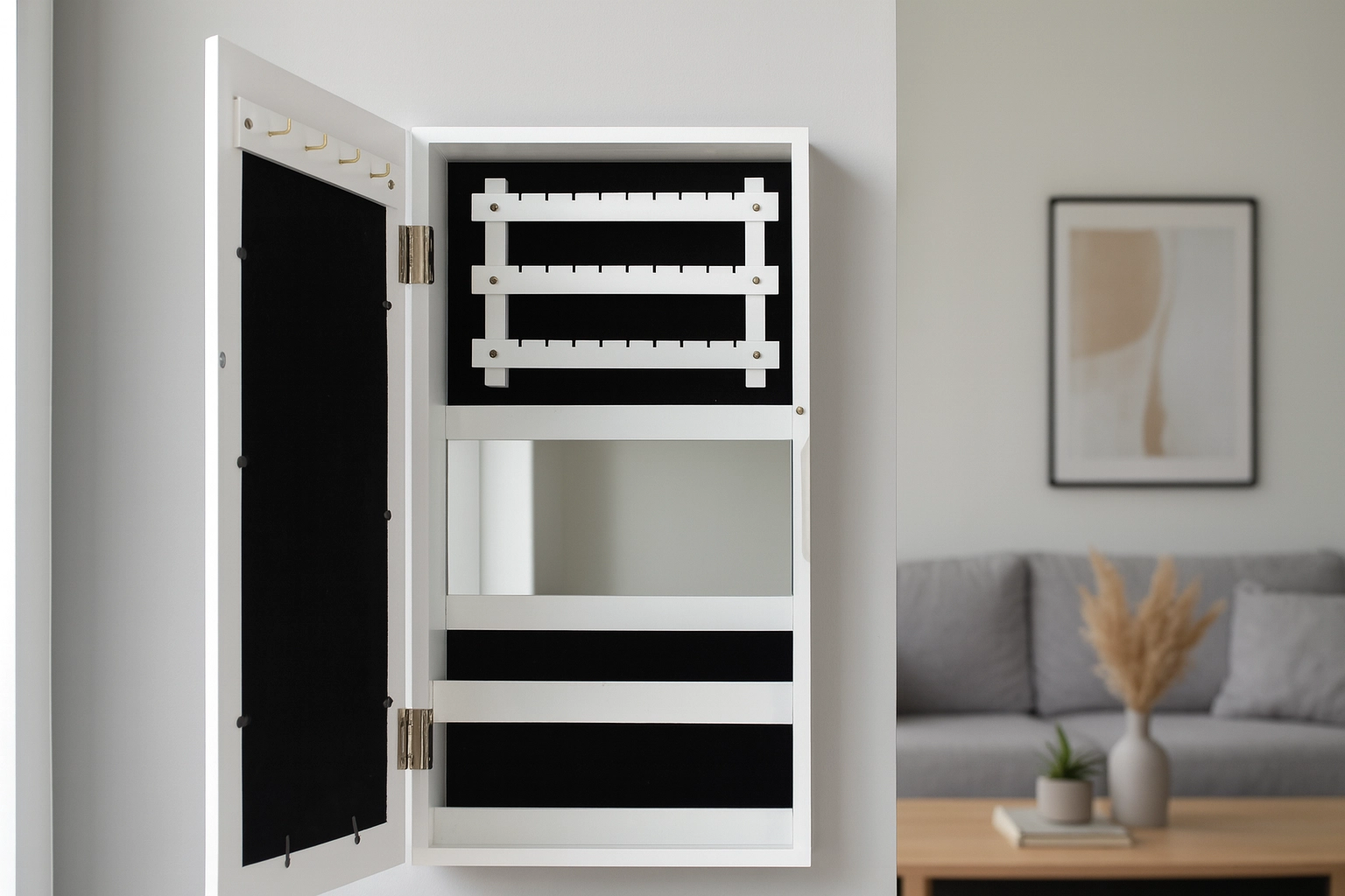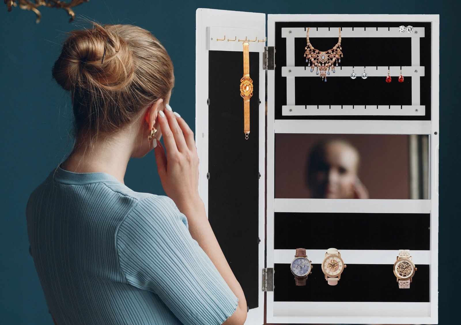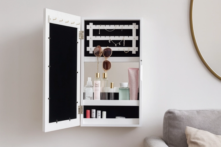 De spiegel aan de binnenzijde van de deur laat je sieraden gemakkelijk met je outfit combineren zonder naar een grote spiegel te hoeven lopen.