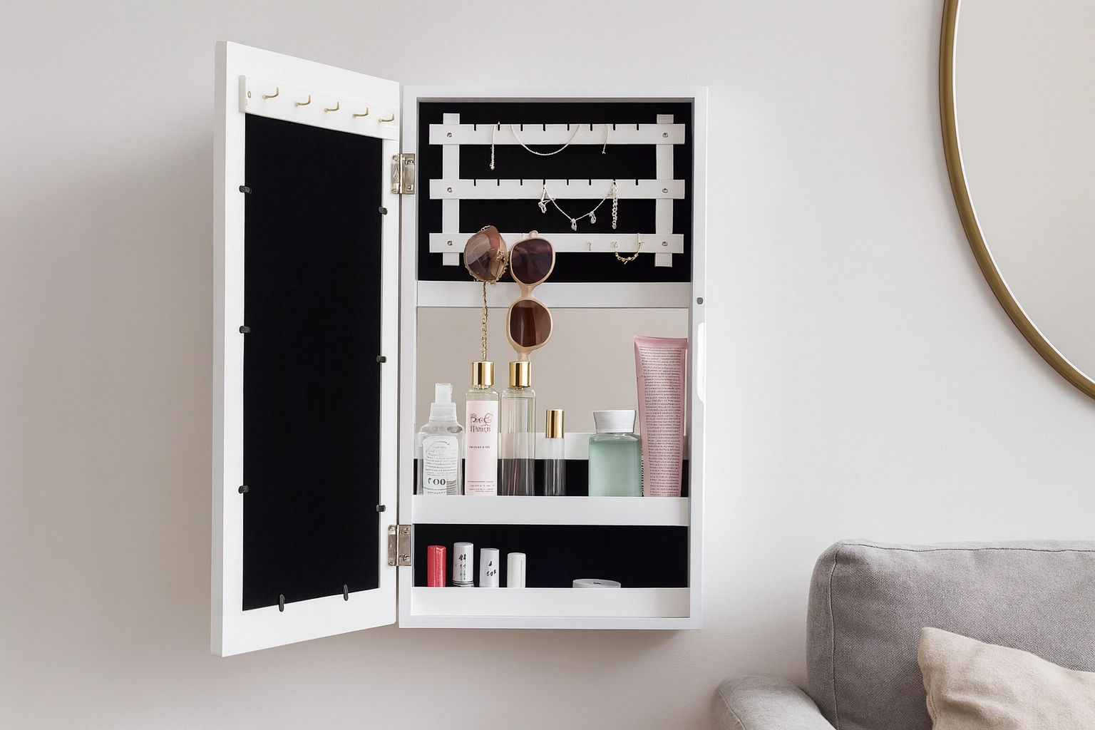 - Wandgemonteerde sieradenkast met spiegel