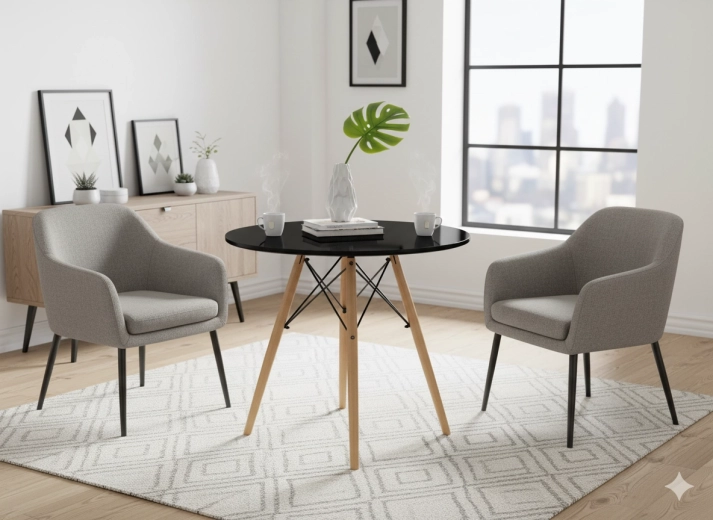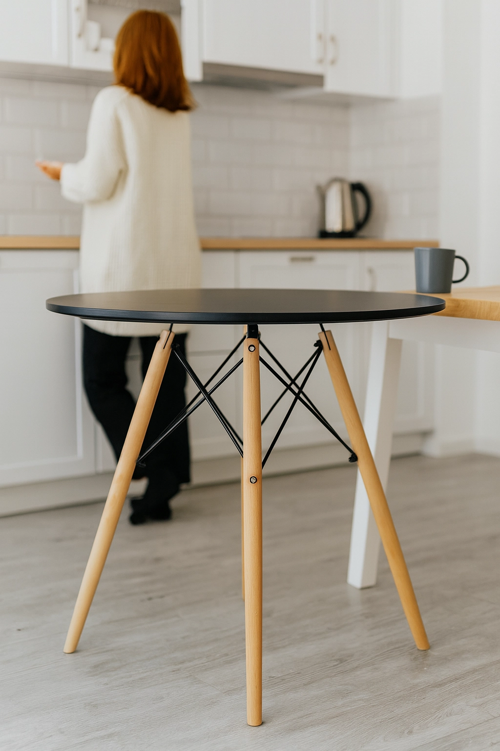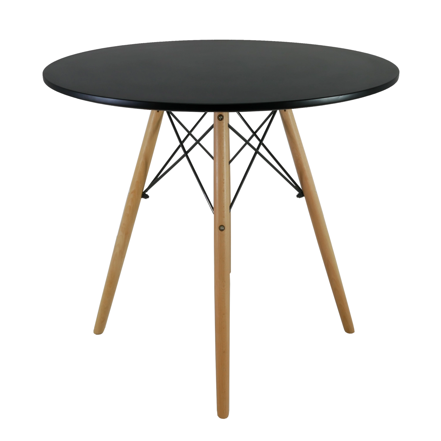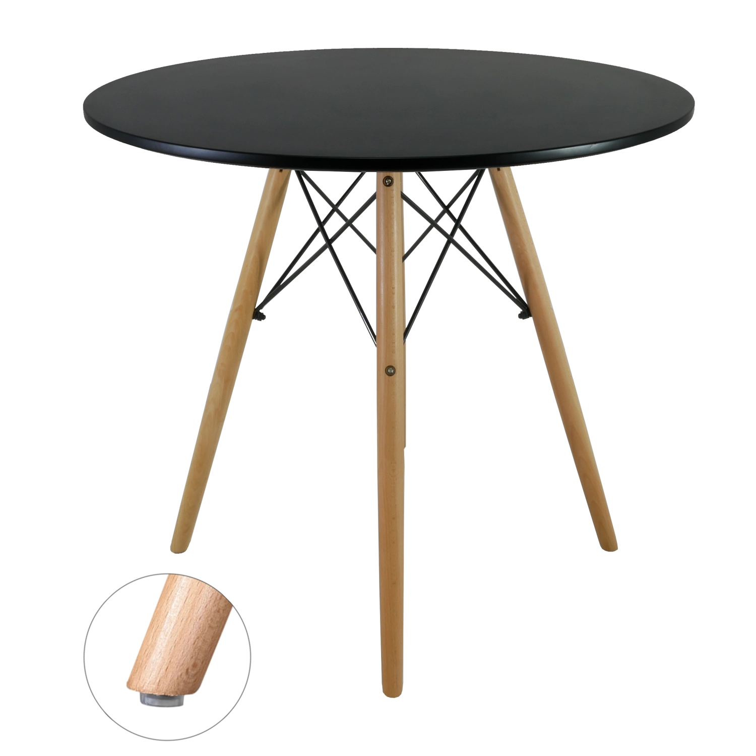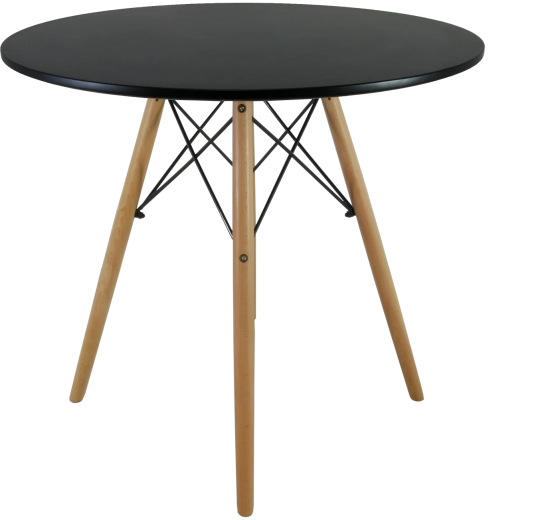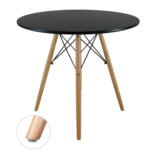 Het matzwarte ronde blad en de natuurlijke houten poten creëren een tijdloze look die eenvoudig te combineren is met diverse interieurstijlen.