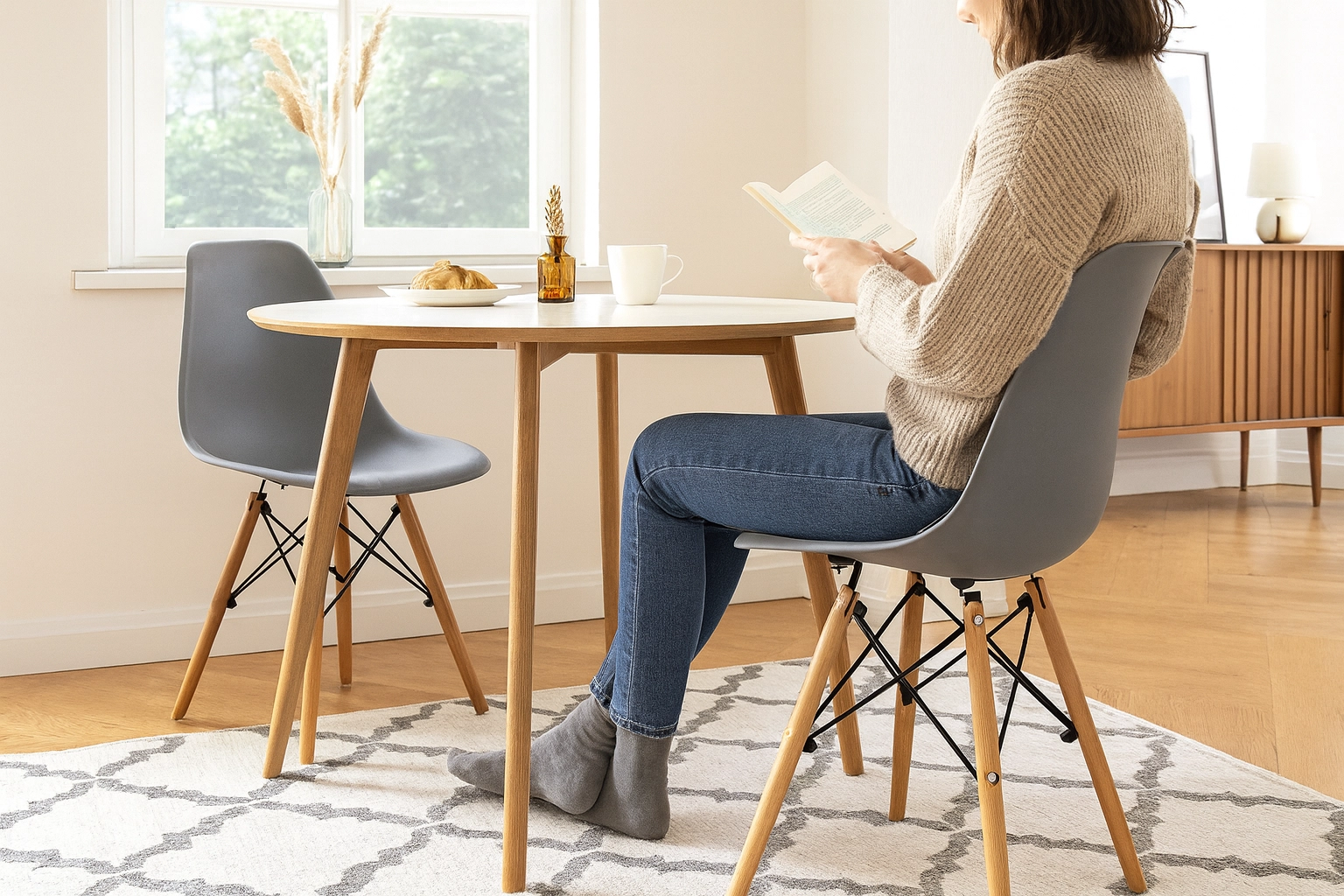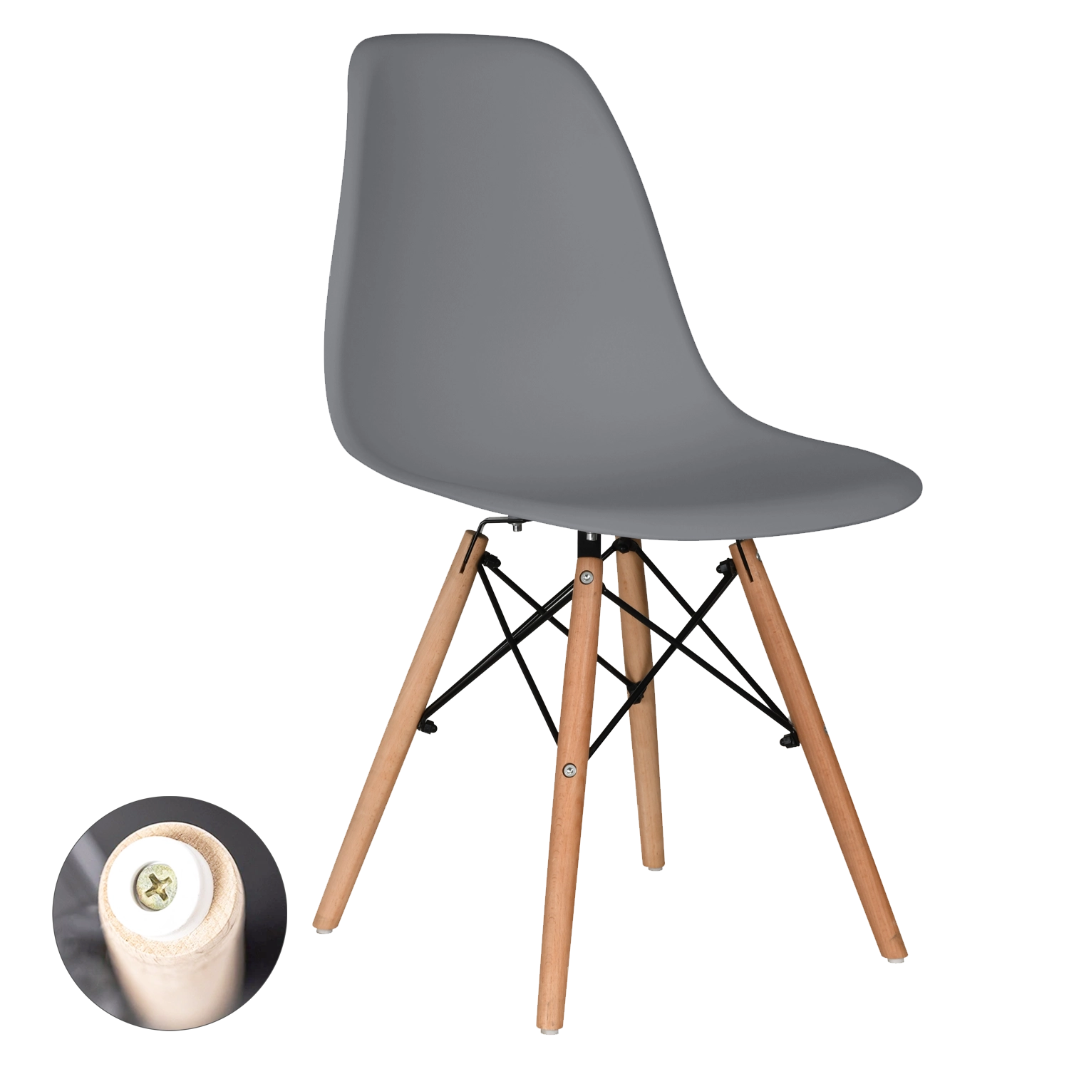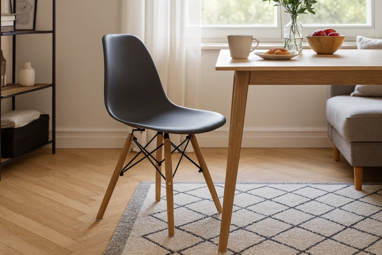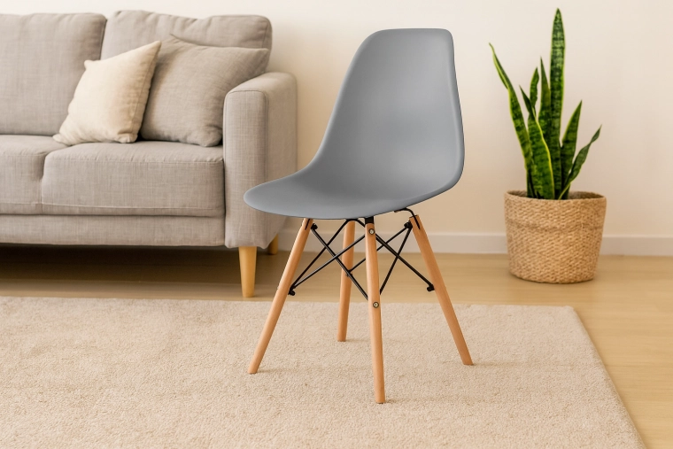 Elegante grijze stoel met een gevormde kunststof zitting die dagelijks zitcomfort en een tijdloze uitstraling brengt in elk interieur – van Scandinavisch tot modern loft. Beukenhouten poten in een warme tint en zwarte metalen verstevigingen geven stabiliteit en visueel contrast.
