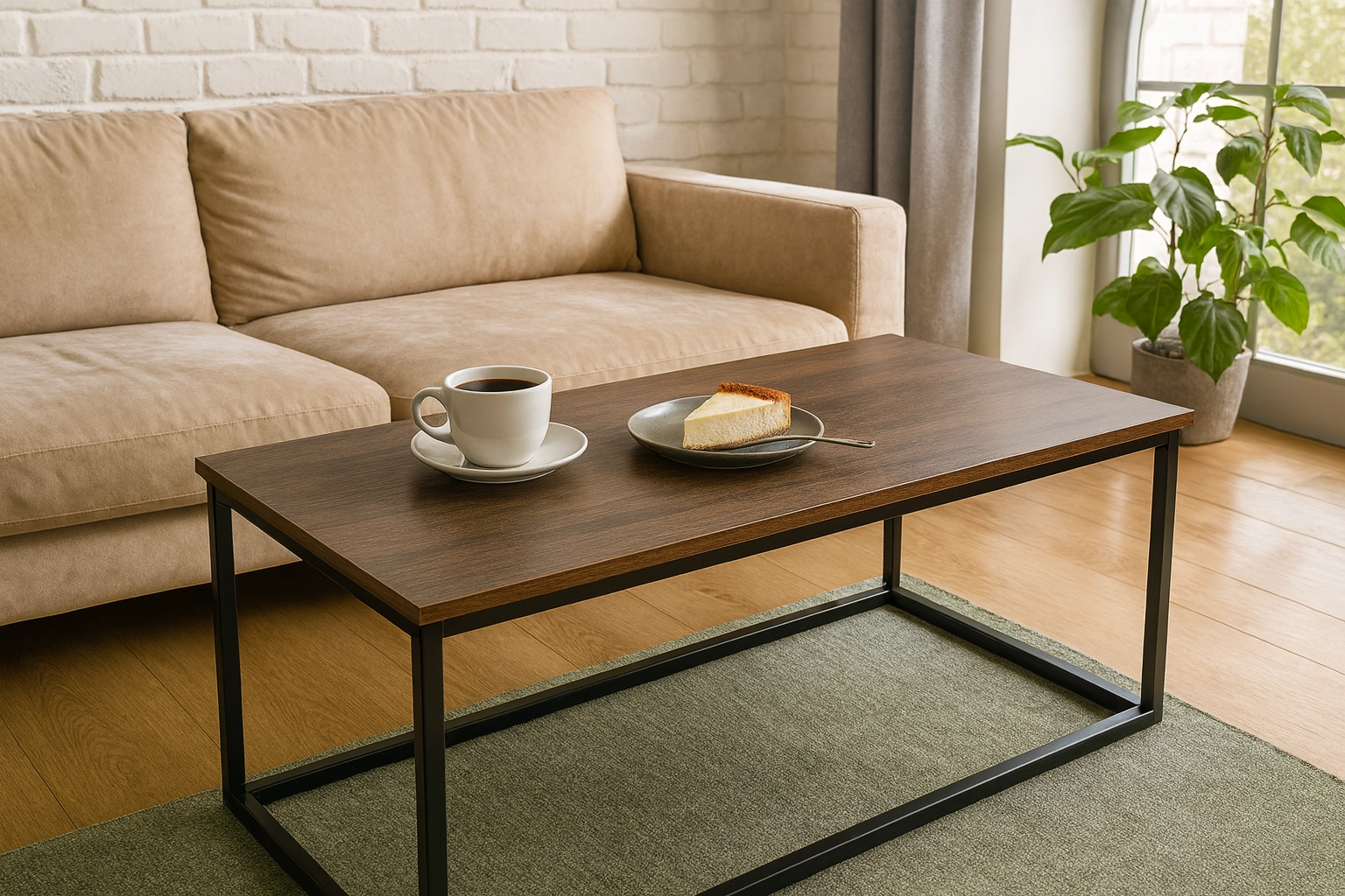 Het MDF-blad in donker houtdecor is glad, gemakkelijk afwasbaar en ideaal voor dagelijks serveren van drankjes of het neerleggen van boeken en decoraties.