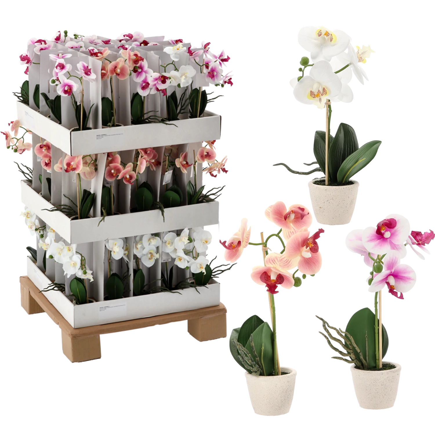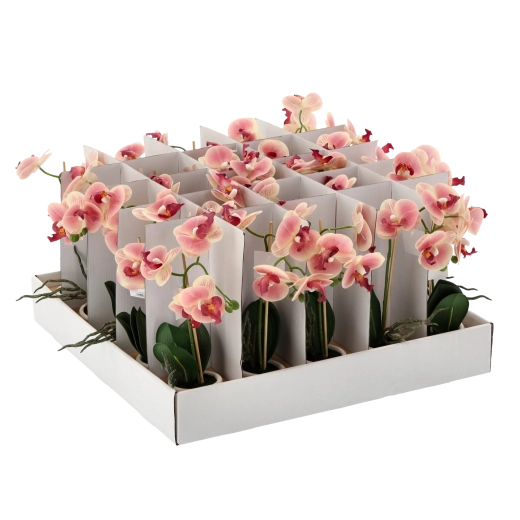 Elk stuk is geplaatst in een decoratieve pot en wordt geleverd in een mix van 3 kleuren – wit, roze en lichtroze. Bloemen, bladeren en stelen zijn met oog voor detail uitgevoerd voor een maximaal levensechte uitstraling.
