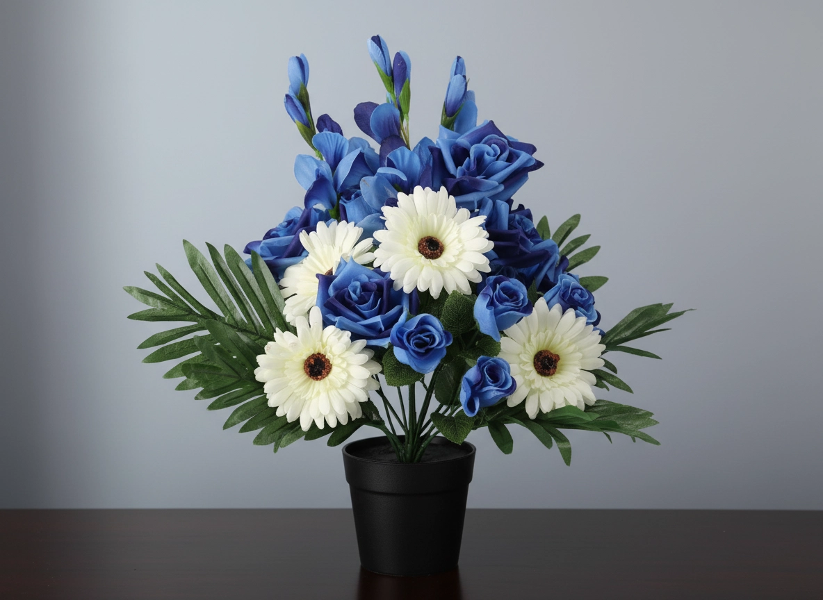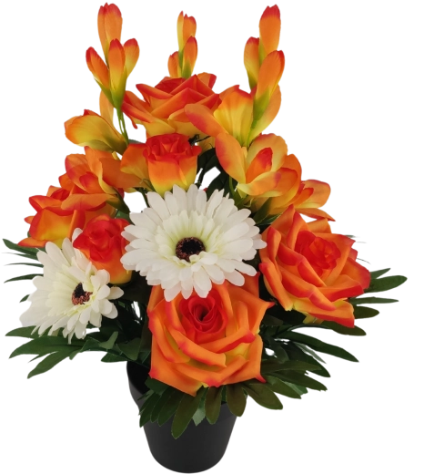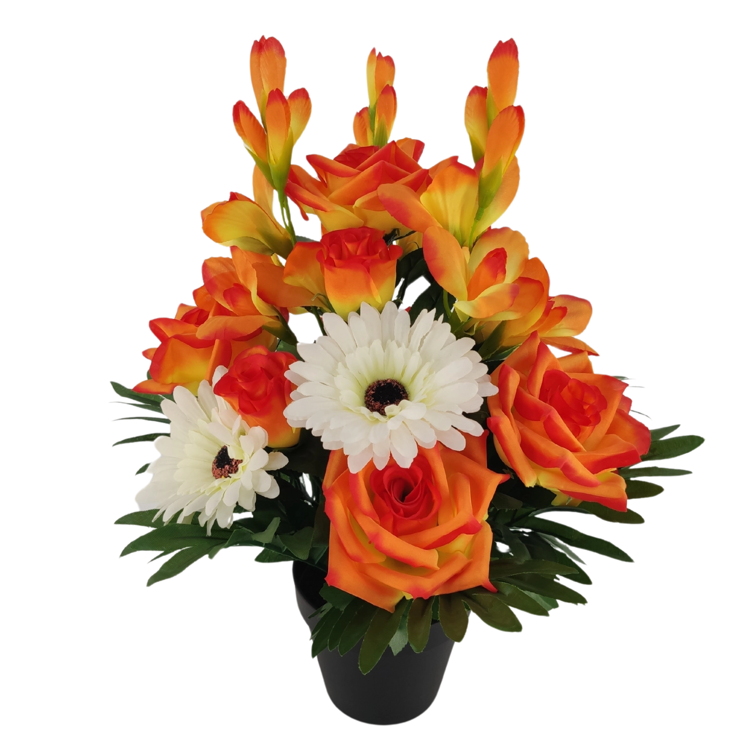 Stijlvolle kunstbloemende decoratie in een elegante bloempot met een hoogte van 43 cm. Realistische bloemen en weelderig groen blad geven het interieur het hele jaar door frisheid – zonder water geven en onderhoud. Verkrijgbaar in 3 kleuropties: oranje, blauw en roze. Ideaal voor op een dressoir, tafel, receptie of bureau.
