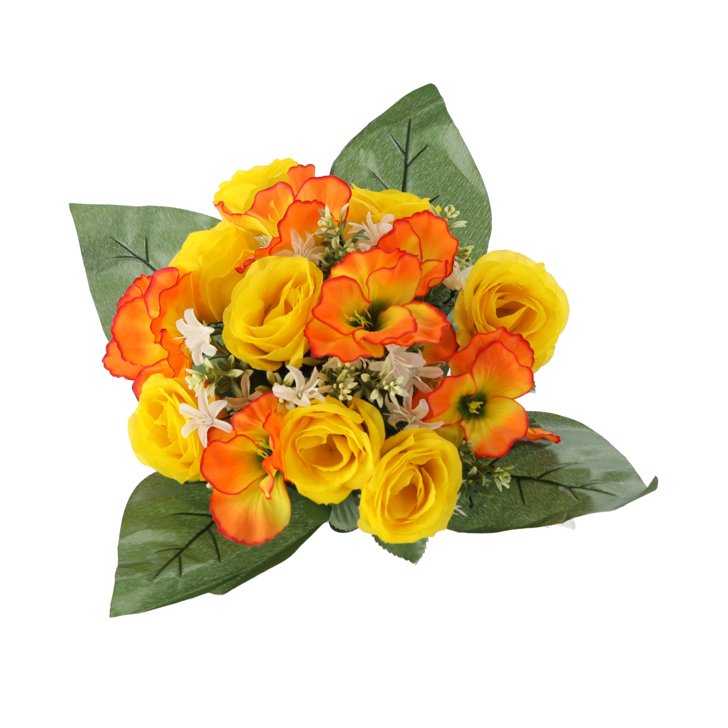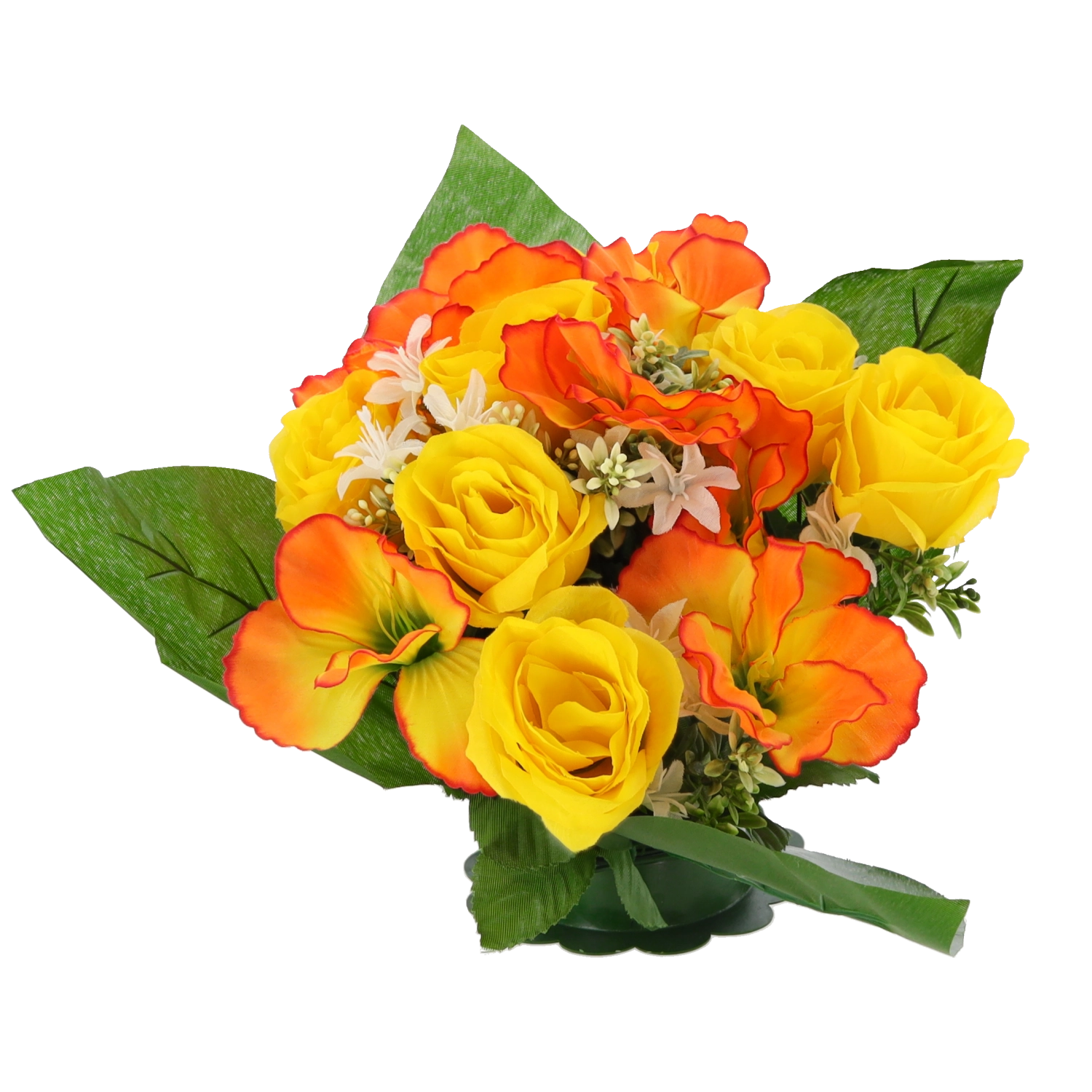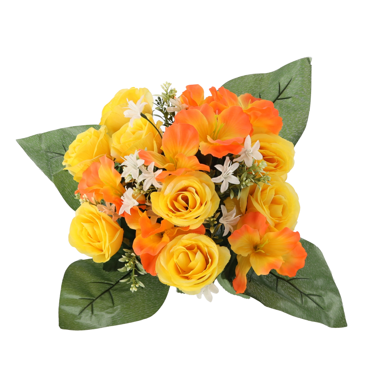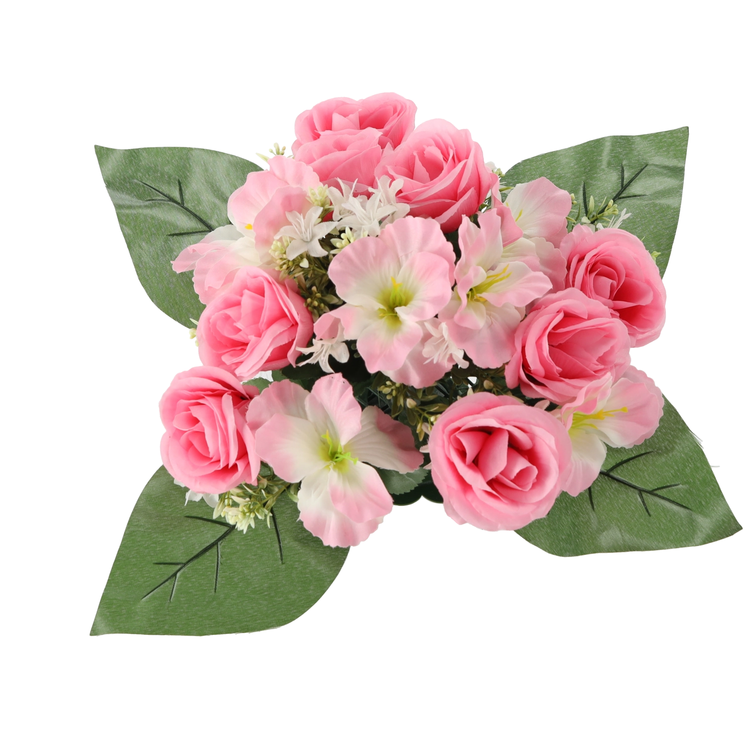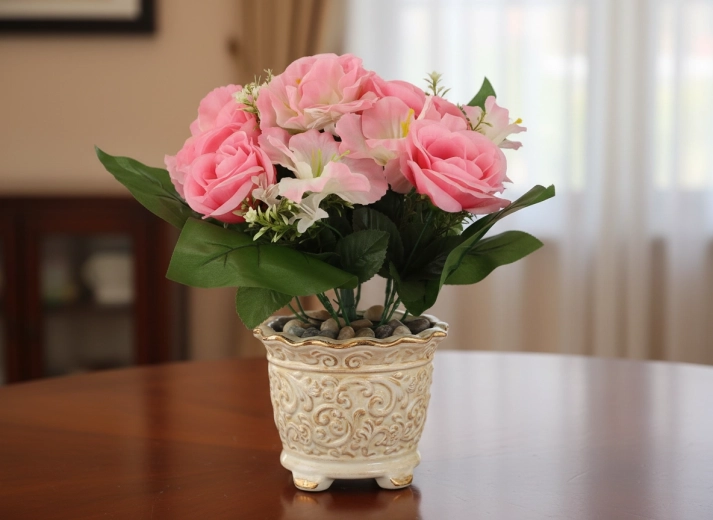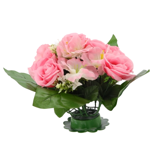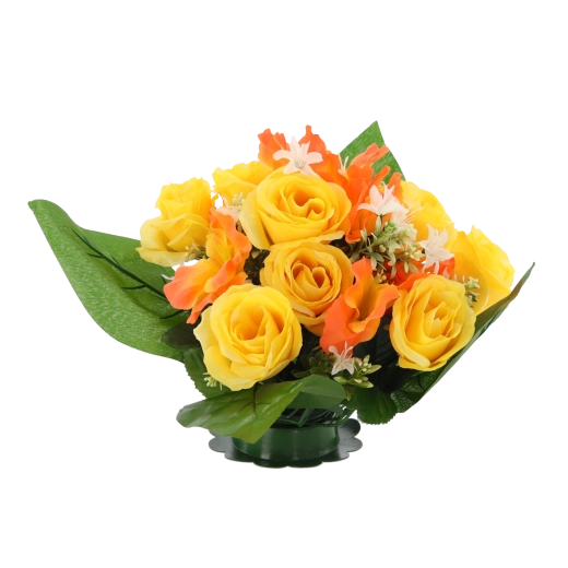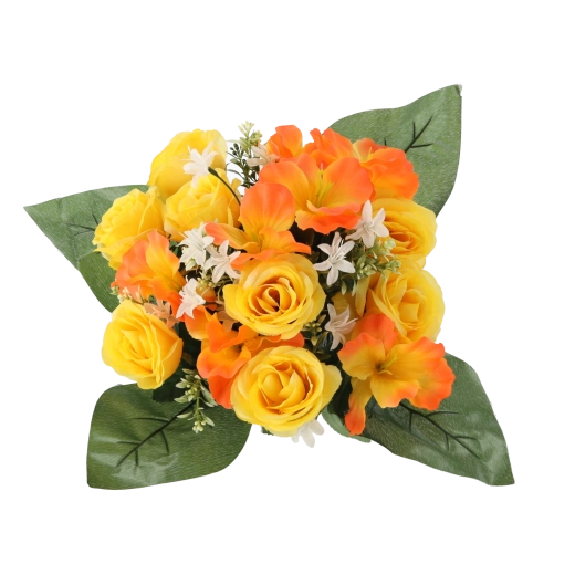 Breng een frisse bloemtoets in huis of kantoor zonder zorgen. Het kunstboeket met rozen en hibiscus valt op door de levensechte uitstraling van bloemblaadjes en bladeren, blijvende vorm en diepe kleuren die niet vervagen. Het compacte formaat past perfect op tafel, dressoir, receptie of een herdenkingsplek.