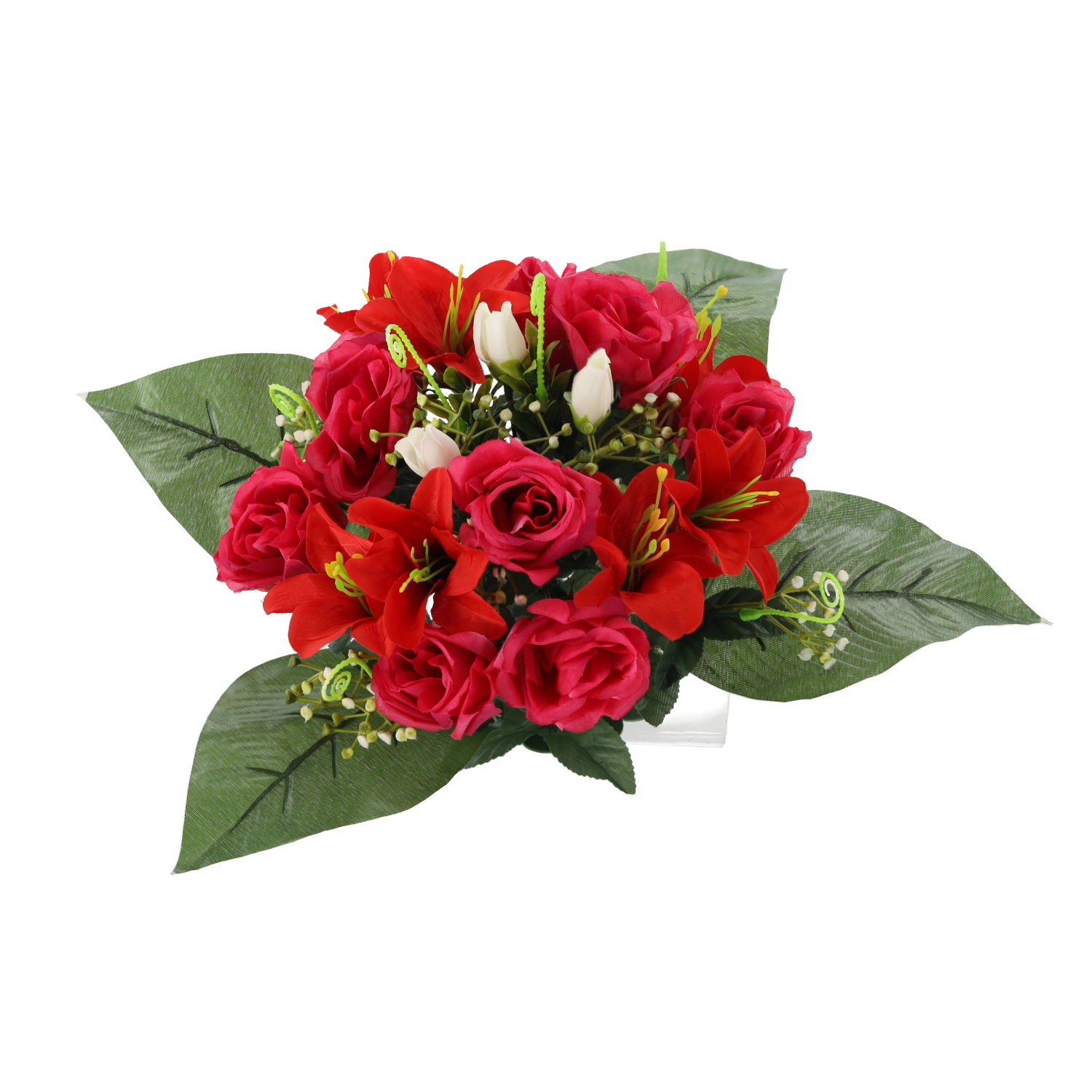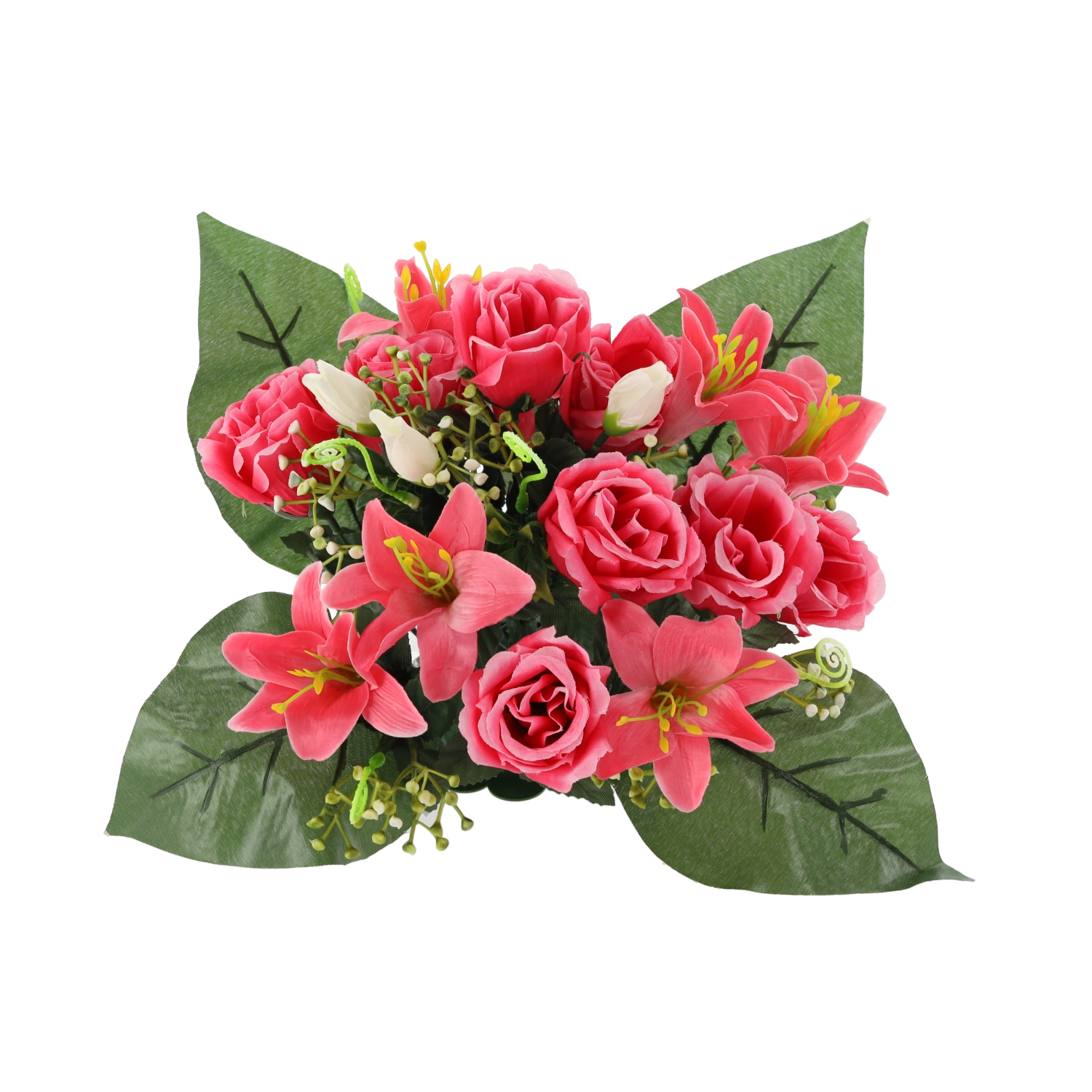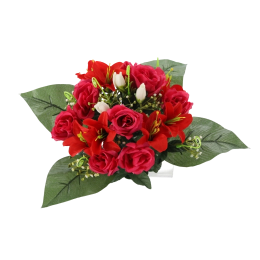 Dit stijlvolle kunstbloemarrangement combineert de tijdloze schoonheid van rozen en lelies met weelderig groen voor een natuurlijke look. Dankzij de compacte afmetingen van 25 × 27 × 27 cm past het gemakkelijk op een tafel, dressoir of vensterbank en geeft het de ruimte direct een frisse en verzorgde uitstraling.